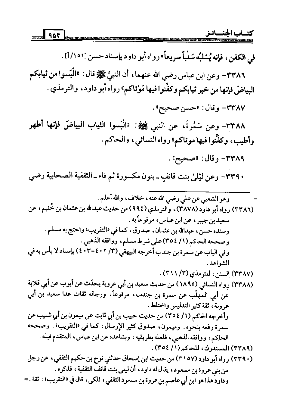 3388 - وَعَن سَمُرَة، عَن النَّبِي صَلَّى اللَّهُ عَلَيْهِ وَسَلَّم َ: " البسوا الثِّيَاب الْبيَاض فَإِنَّهَا أطهر وَأطيب، وكفنوا فِيهَا مَوْتَاكُم " رَوَاهُ النَّسَائِيّ، وَالْحَاكِم.