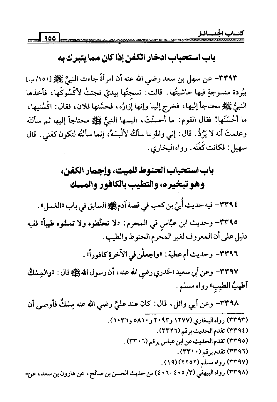 3393 - عَن سهل بن سعد رَضِيَ اللَّهُ عَنْه أَن امْرَأَة جَاءَت النَّبِي صَلَّى اللَّهُ عَلَيْهِ وَسَلَّم َ [151 / ب] بِبُرْدَةٍ منسوجة فِيهَا حاشيتها. قَالَت: نسجتها بيَدي فَجئْت لأكسوكها، فَأَخذهَا النَّبِي صَلَّى اللَّهُ عَلَيْهِ وَسَلَّم َ مُحْتَاجا إِلَيْهَا، فَخرج إِلَيْنَا وَإِنَّهَا إزَاره، فحسنها فلَان، فَقَالَ: اكسنيها، مَا أحْسنهَا! فَقَالَ الْقَوْم: مَا أَحْسَنت، البسها النَّبِي صَلَّى اللَّهُ عَلَيْهِ وَسَلَّم َ مُحْتَاجا إِلَيْهَا ثمَّ سَأَلته وَعلمت أَنه لَا يرد. قَالَ: إِنِّي وَالله مَا سَأَلته لألبسه، إِنَّمَا سَأَلته لتَكون كفني. قَالَ سُهَيْل: فَكَانَت كَفنه. رَوَاهُ البُخَارِيّ.