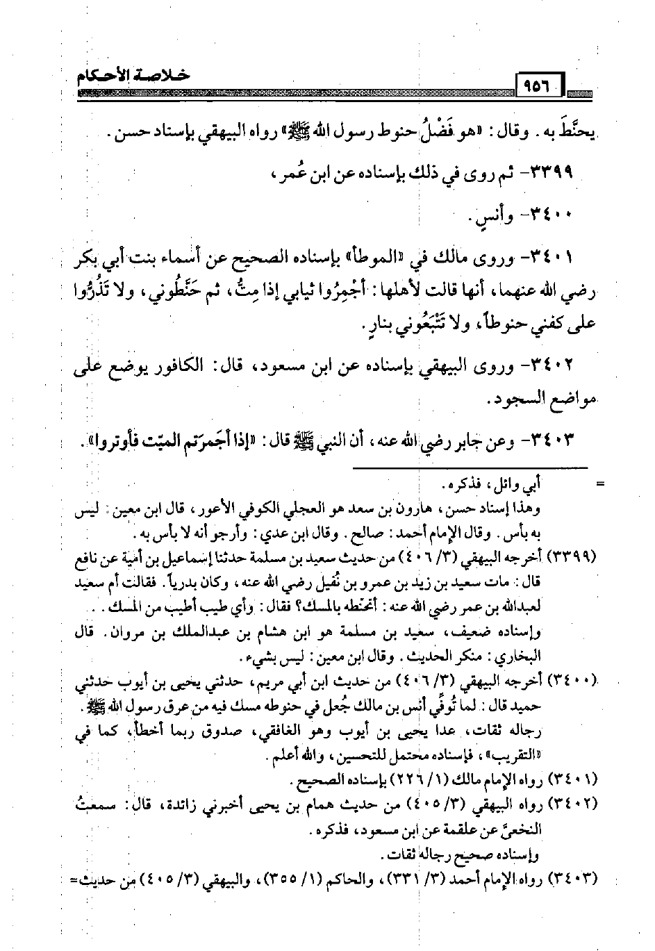3402 - وَرَوَى الْبَيْهَقِيّ بِإِسْنَادِهِ عَن ابْن مَسْعُود، قَالَ: الكافور يوضع عَلَى مَوَاضِع السُّجُود.
