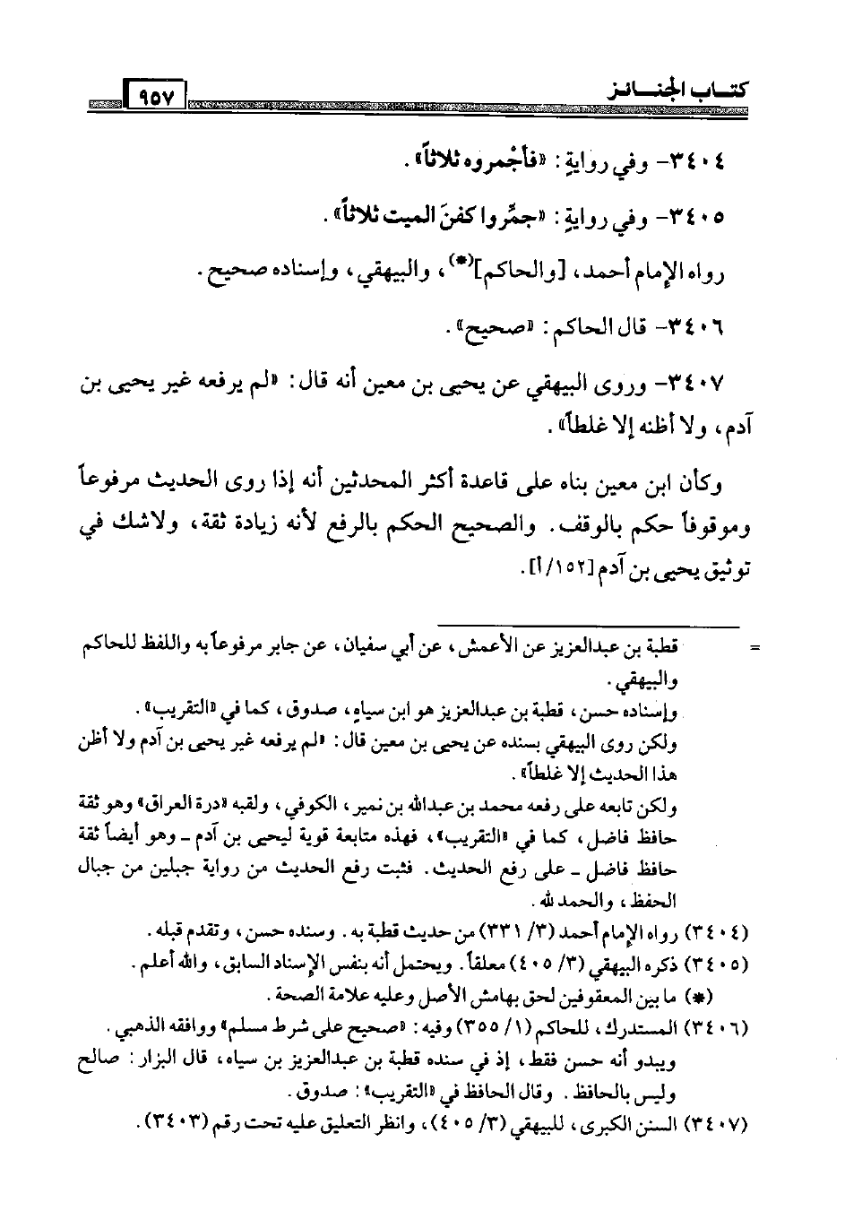 3407 - وَرَوَى الْبَيْهَقِيّ عَن يَحْيَى بن معِين أَنه قَالَ: " لم يرفعهُ غير يَحْيَى بن آدم، وَلَا أَظُنهُ إِلَّا غَلطا ". وَكَأن ابْن معِين بناه عَلَى قَاعِدَة أَكثر الْمُحدثين أَنه إِذا رَوَى الحَدِيث مَرْفُوعا وموقوفاً حكم بِالْوَقْفِ. وَالصَّحِيح الحكم بِالرَّفْع لِأَنَّهُ زِيَادَة ثِقَة، وَلَا شكّ فِي تَوْثِيق يَحْيَى بن آدم [152 / أ] .