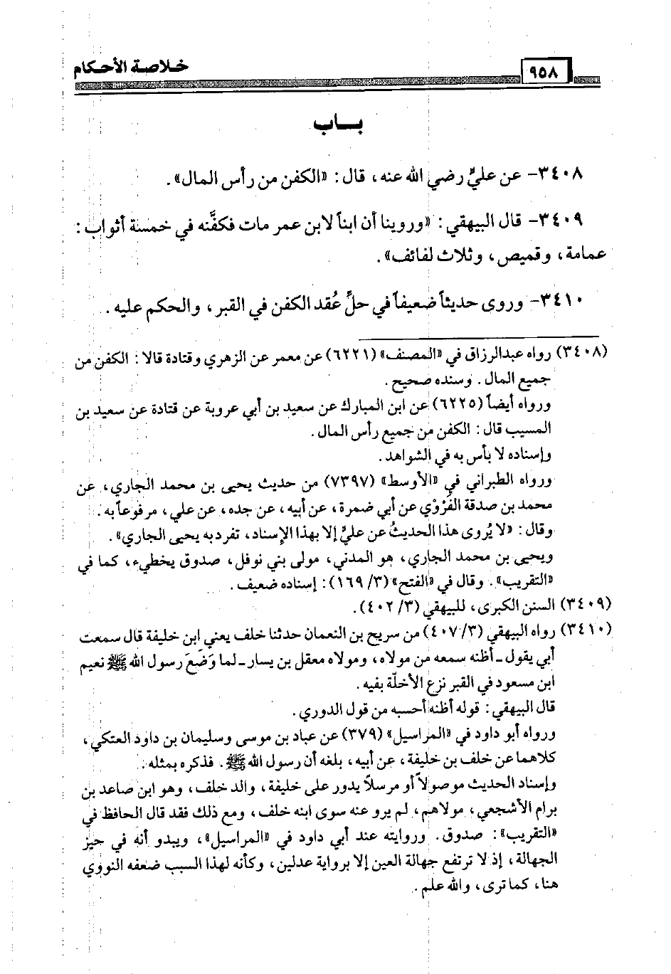 3408 - عَن عَلّي رَضِيَ اللَّهُ عَنْه، قَالَ: " الْكَفَن من رَأس المَال ".