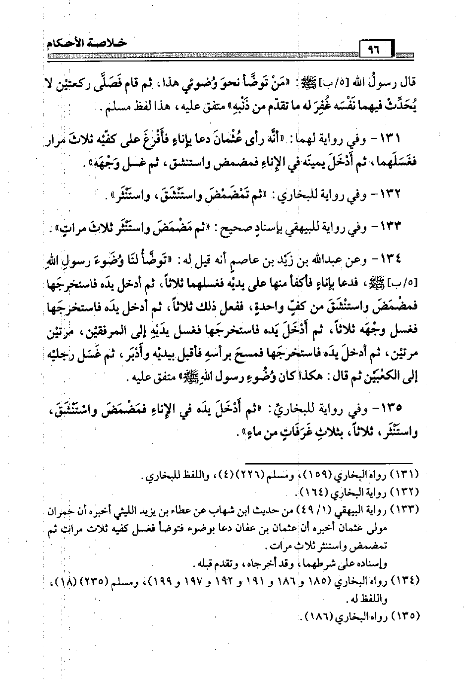 135 - وَفِي رِوَايَة للْبُخَارِيّ: " ثمَّ أَدخل يَده فِي الْإِنَاء فَمَضْمض واستنشق، واستنثر، ثَلَاثًا، بِثَلَاث غرفات من مَاء ".