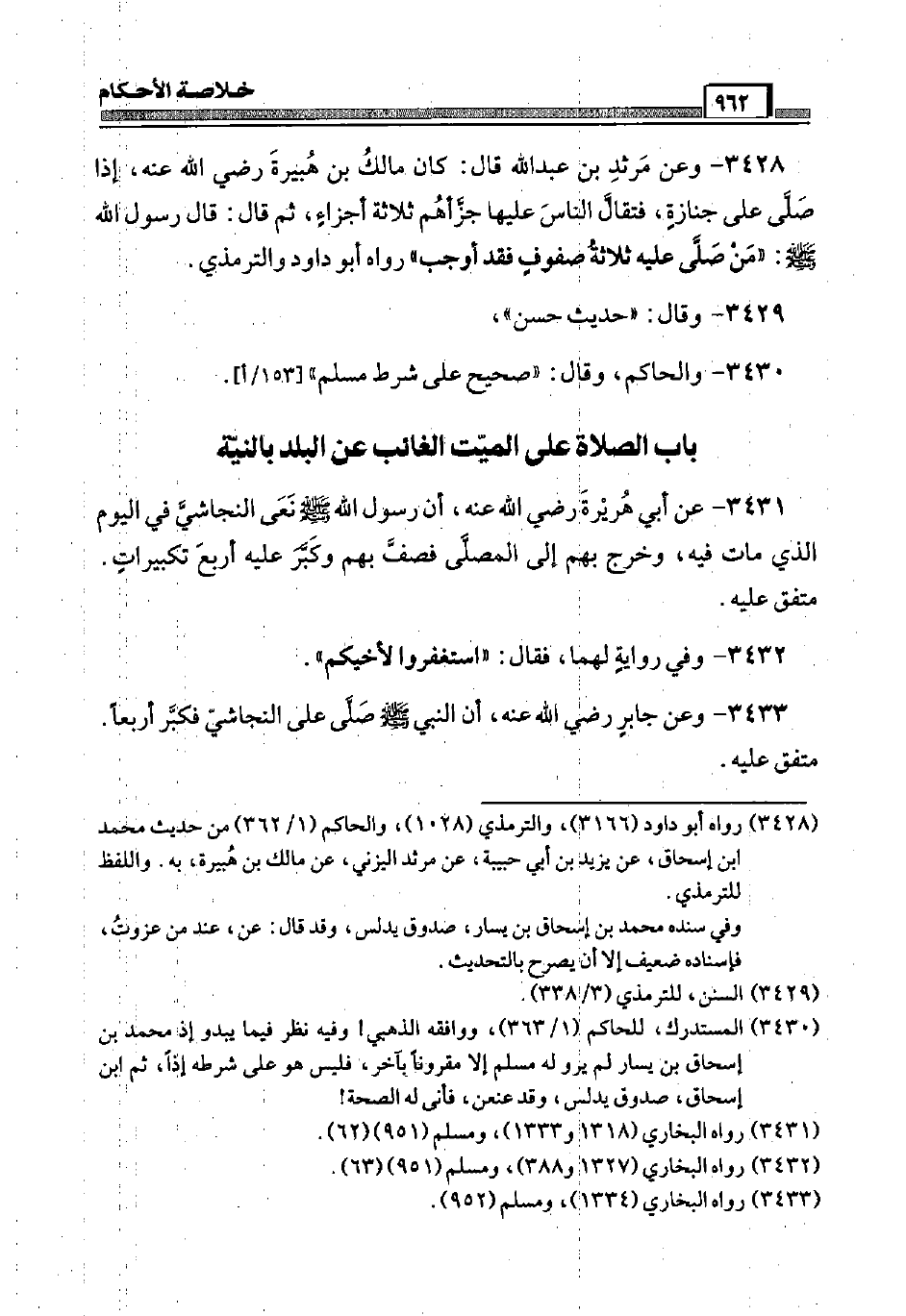 3433 - وَعَن جَابر رَضِيَ اللَّهُ عَنْه، أَن النَّبِي صَلَّى اللَّهُ عَلَيْهِ وَسَلَّم َ صَلَّى عَلَى النَّجَاشِيّ فكبّر أَرْبعا. مُتَّفق عَلَيْهِ.