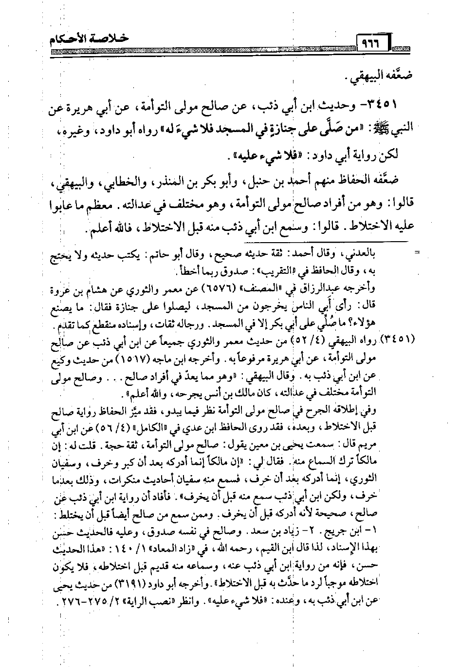 3451 - وَحَدِيث ابْن أبي ذِئْب، عَن صَالح مولَى التَّوْأَمَة، عَن أبي هُرَيْرَة عَن النَّبِي صَلَّى اللَّهُ عَلَيْهِ وَسَلَّم َ: " من صَلَّى عَلَى جَنَازَة فِي الْمَسْجِد فَلَا شَيْء لَهُ " رَوَاهُ أَبُو دَاوُد، وَغَيره، لَكِن رِوَايَة أبي دَاوُد: " فَلَا شَيْء عَلَيْهِ ". ضعفه الْحفاظ مِنْهُم أَحْمد بن حَنْبَل، وَأَبُو بكر بن الْمُنْذر، والخطابي، وَالْبَيْهَقِيّ، قَالُوا: وَهُوَ من أَفْرَاد صَالح مولَى التَّوْأَمَة، وَهُوَ مُخْتَلف فِي عَدَالَته. مُعظم مَا عابوا عَلَيْهِ الِاخْتِلَاط. قَالُوا: وَسمع ابْن أبي ذِئْب مِنْهُ قبل الِاخْتِلَاط، فَالله أعلم.
