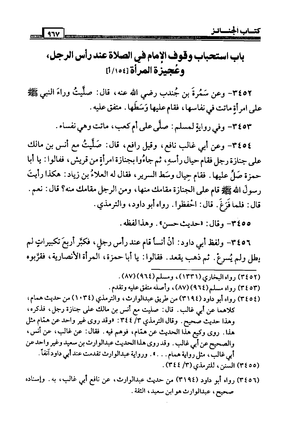 3452 - وَعَن سَمُرَة بن جُنْدُب رَضِيَ اللَّهُ عَنْه، قَالَ: صليت وَرَاء النَّبِي صَلَّى اللَّهُ عَلَيْهِ وَسَلَّم َ عَلَى امْرَأَة مَاتَت فِي نفَاسهَا، فَقَامَ عَلَيْهَا وَسطهَا. مُتَّفق عَلَيْهِ.