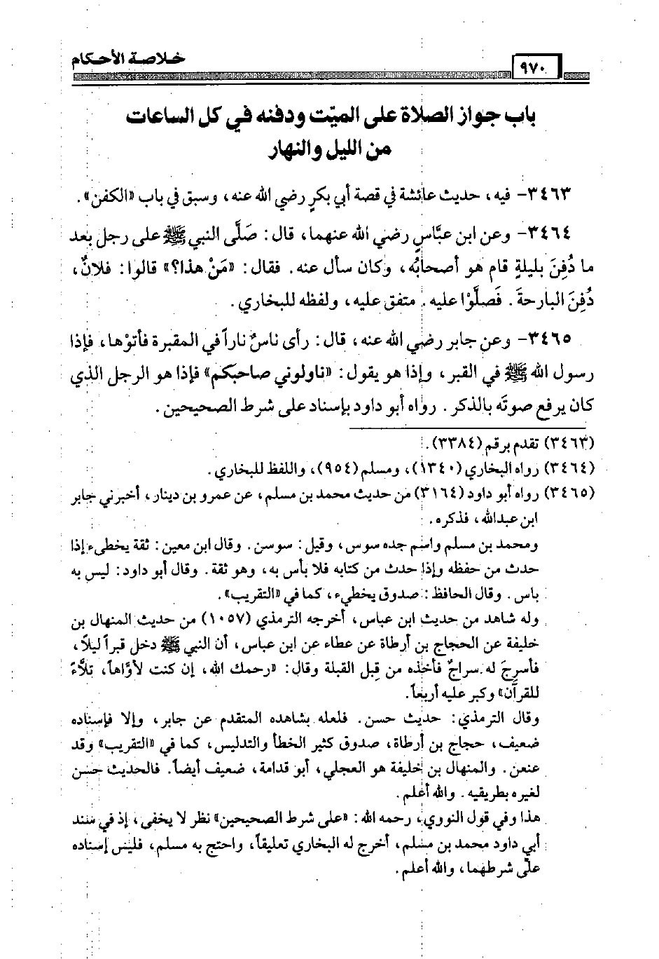 3464 - وَعَن ابْن عَبَّاس رَضِيَ اللَّهُ عَنْهما، قَالَ: صَلَّى النَّبِي صَلَّى اللَّهُ عَلَيْهِ وَسَلَّم َ عَلَى رجل بعد مَا دفن بليلة قَامَ هُوَ أَصْحَابه، وَكَانَ سَأَلَ عَنهُ. فَقَالَ: " من هَذَا؟ " قَالُوا: فلَان، دفن البارحة. فصلوا عَلَيْهِ. مُتَّفق عَلَيْهِ، وَلَفظه للْبُخَارِيّ.