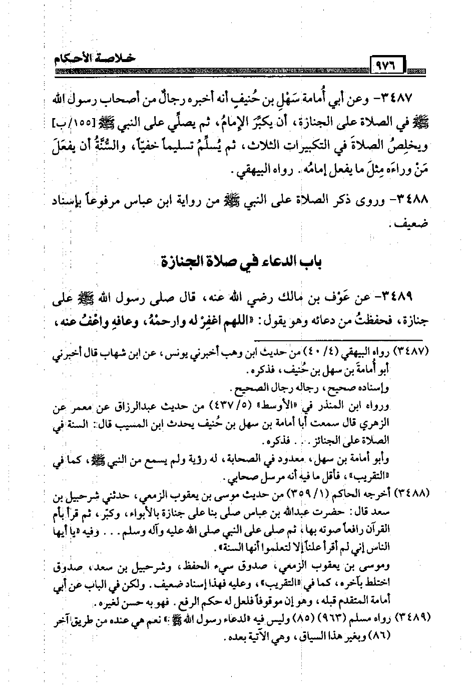 3487 - وَعَن أبي أُمَامَة سهل بن حنيف أَنه أخبرهُ رجال من أَصْحَاب رَسُول الله صَلَّى اللَّهُ عَلَيْهِ وَسَلَّم َ فِي الصَّلَاة عَلَى الْجِنَازَة، أَن يكبر الإِمَام، ثمَّ يُصَلِّي عَلَى النَّبِي صَلَّى اللَّهُ عَلَيْهِ وَسَلَّم َ [155 / ب] ويخلص الصَّلَاة فِي التَّكْبِيرَات الثَّلَاث، ثمَّ يسلم تَسْلِيمًا خفِيا، وَالسّنة أَن يفعل من وَرَاءه مثل مَا يفعل إِمَامه. رَوَاهُ الْبَيْهَقِيّ.