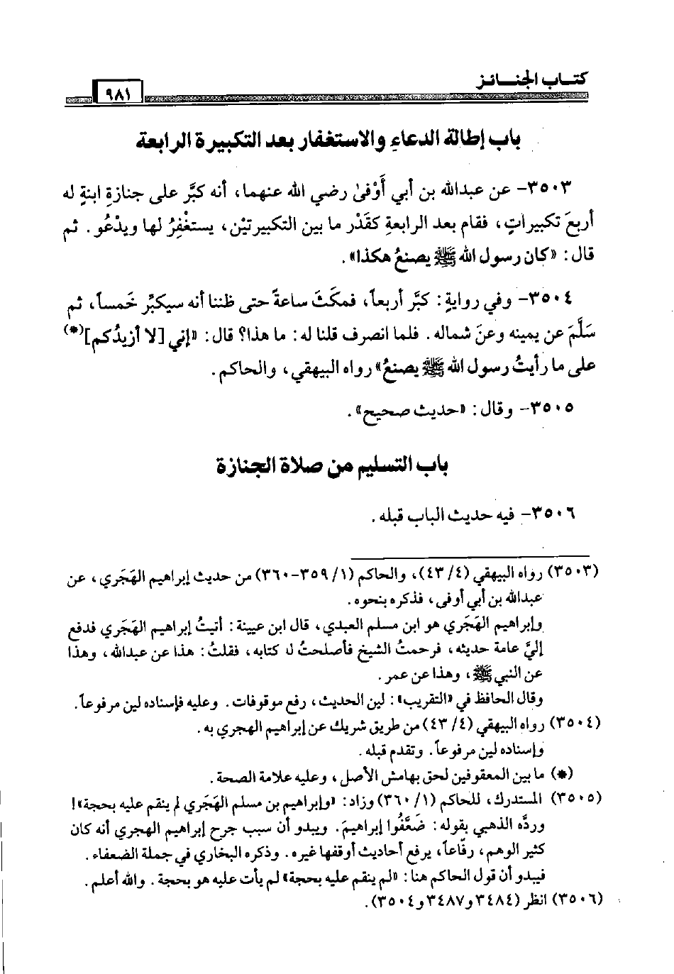 3503 - عَن عبد الله بن أبي أَوْفَى رَضِيَ اللَّهُ عَنْهما، أَنه كبر عَلَى جَنَازَة ابْنة لَهُ أَربع تَكْبِيرَات، فَقَامَ بعد الرَّابِعَة كَقدْر مَا بَين التكبيرتين، يسْتَغْفر لَهَا وَيَدْعُو. ثمَّ قَالَ: " كَانَ رَسُول الله صَلَّى اللَّهُ عَلَيْهِ وَسَلَّم َ يصنع هَكَذَا ".