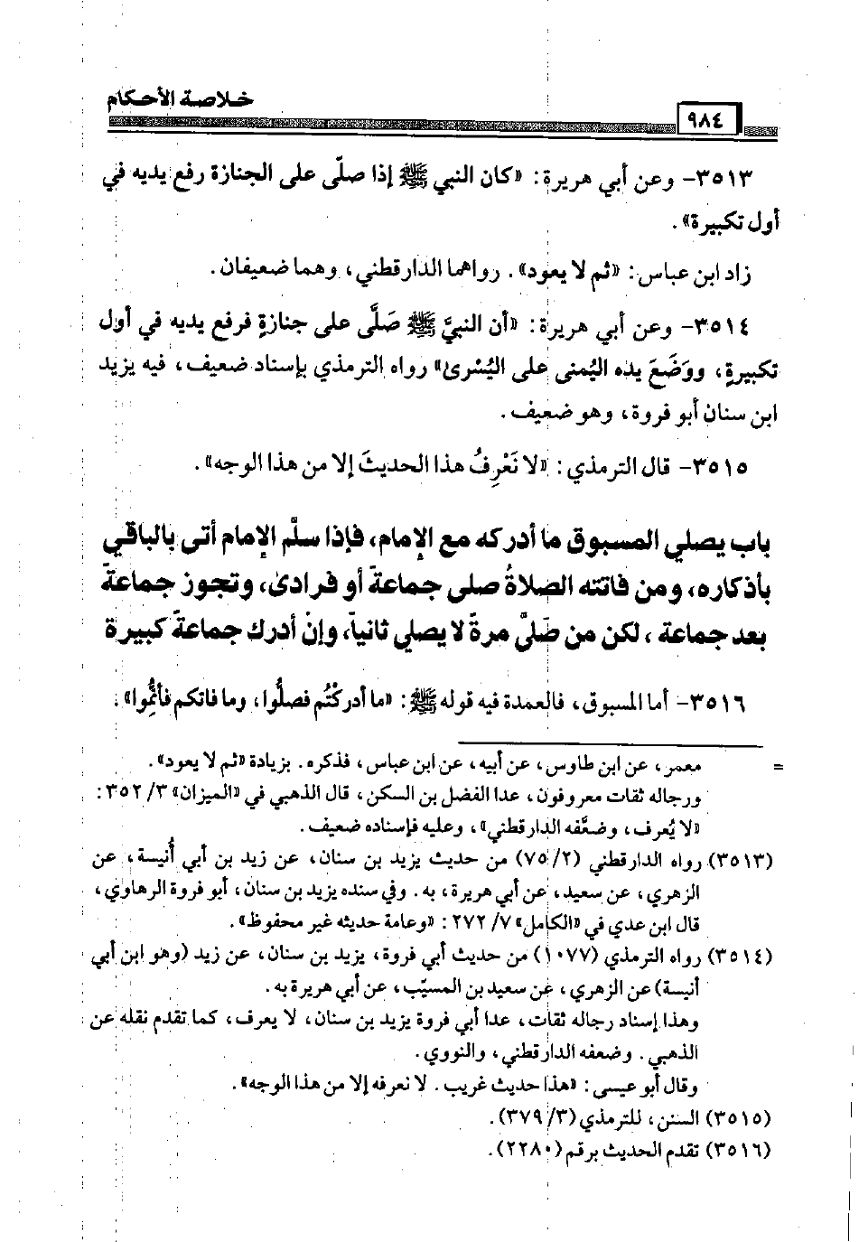 3513 - وَعَن أبي هُرَيْرَة: " كَانَ النَّبِي صَلَّى اللَّهُ عَلَيْهِ وَسَلَّم َ إِذا صَلَّى عَلَى الْجِنَازَة رفع يَدَيْهِ فِي أول تَكْبِيرَة ". زَاد ابْن عَبَّاس: " ثمَّ لَا يعود ". رَوَاهُمَا الدراقطني، وهما ضعيفان.