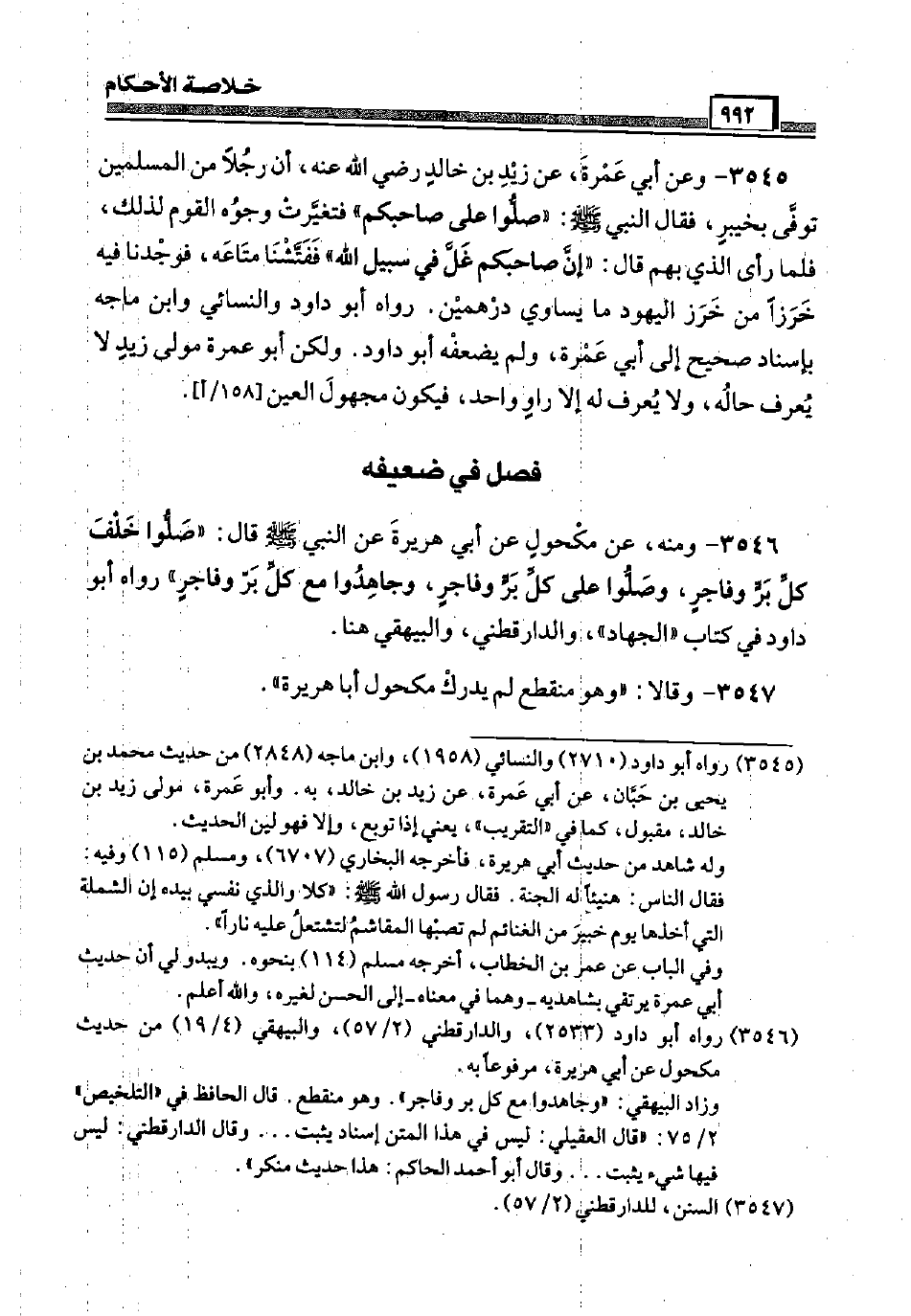 3545 - وَعَن أبي عمْرَة، عَن زيد بن خَالِد رَضِيَ اللَّهُ عَنْه، أَن رجلا من الْمُسلمين توفّي بِخَيْبَر، فَقَالَ النَّبِي صَلَّى اللَّهُ عَلَيْهِ وَسَلَّم َ: " صلوا عَلَى صَاحبكُم " فتغيرت وُجُوه الْقَوْم لذَلِك، فَلَمَّا رَأَى الَّذِي بهم قَالَ: " إِن صَاحبكُم غل فِي سَبِيل الله " ففتشنا مَتَاعه، فَوَجَدنَا فِيهِ خرزا من خرز الْيَهُود مَا يُسَاوِي دِرْهَمَيْنِ. رَوَاهُ أَبُو دَاوُد وَالنَّسَائِيّ وَابْن ماجة بِإِسْنَاد صَحِيح إِلَى أبي عمْرَة، وَلم يُضعفهُ أَبُو دَاوُد. وَلَكِن أَبُو عمْرَة مولَى زيد لَا يعرف حَاله، وَلَا يعرف لَهُ إِلَّا راو وَاحِد، فَيكون مَجْهُول الْعين [158 / أ] .