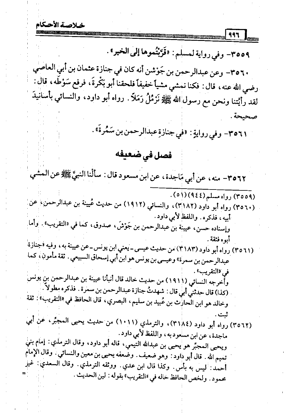 3560 - وَعَن عبد الرَّحْمَن بن جوشن أَنه كَانَ فِي جَنَازَة عُثْمَان بن أبي العَاصِي رَضِيَ اللَّهُ عَنْه، قَالَ: فَكُنَّا نمشي مشيا خَفِيفا فلحقنا أَبُو بكرَة، فَرفع سَوْطه، قَالَ: لقد رَأَيْتنَا وَنحن مَعَ رَسُول الله صَلَّى اللَّهُ عَلَيْهِ وَسَلَّم َ نرمل رملا. رَوَاهُ أَبُو دَاوُد، وَالنَّسَائِيّ بأسانيد صَحِيحَة.