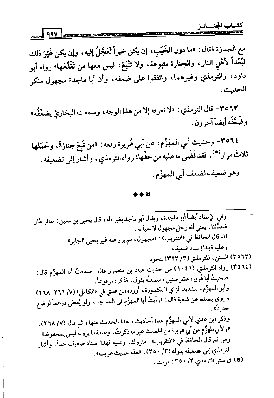 3564 - وَحَدِيث أبي المهزم، عَن أبي هُرَيْرَة رَفعه: " من تبع جَنَازَة، وَحملهَا ثَلَاث مرار، فقد قَضَى مَا عَلَيْهِ من حَقّهَا " رَوَاهُ التِّرْمِذِيّ، وَأَشَارَ إِلَى تَضْعِيفه. وَهُوَ ضَعِيف لضعف أبي المهزم.