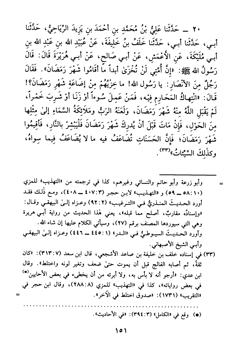 20- حَدَّثَنَا عَلِيُّ بْنُ مُحَمَّدِ بْنِ أَحْمَدَ بْنِ يَزِيدَ الرِّيَاحِيُّ، حَدَّثَنَا أَبِي حَدَّثَنَا أَبِي حَدَّثَنَا خَلَفُ بْنُ خَلِيفَةَ، عَنْ عُبْيد اللَّهِ بْنِ عبدِ اللَّهِ بْنِ أَبِي مُلَيْكَةَ، عَنِ الْأَعْمَشِ، عَنْ أَبِي صَالِحٍ، عَنْ أَبِي هُرَيْرَةَ، قَالَ: قَالَ رَسُولُ اللَّهِ صَلَّى اللَّهُ عَلَيْهِ وَسَلَّمَ: إِنَّ §أُمَّتِي لَنْ تُخْزَى أَبَدًا مَا أَقَامُوا شَهْرَ رَمَضَانَ، فَقَالَ رَجُلٌ مِنَ الْأَنْصَارِ: يَا رَسُولَ اللَّهِ، مَا خِزْيُهُمْ مِنْ إِضَاعَةِ شَهْرِ رَمَضَانَ؟ ، قَالَ: انْتِهَاكُ الْمَحَارِمِ فِيهِ , فَمَنْ عَمِلَ سُوءًا، أَوْ زَنَى أَوْ شَرِبَ خَمْرًا، لَمْ يَقْبَلِ اللَّهُ مِنْهُ شَهْرَ رَمَضَانَ، وَلَعَنَهُ الرَّبُّ وَمَلَائِكَةُ السَّمَاءِ إِلَى مِثْلِهَا مِنَ الْحَوْلِ، فَإِنْ مَاتَ قَبْلَ أَنْ يُدْرِكَ شَهْرَ رَمَضَانَ فَلْيُبَشَّرُ بِالنَّارِ، فَأَقِيمُوا شَهْرَ رَمَضَانَ، فَإِنَّ الْحَسَنَاتِ تُضَاعِفُ فِيهِ مَا لَا يُضَاعَفُ فِيمَا سِوَاهُ، وَكَذَلِكَ السَّيِّئَاتُ.