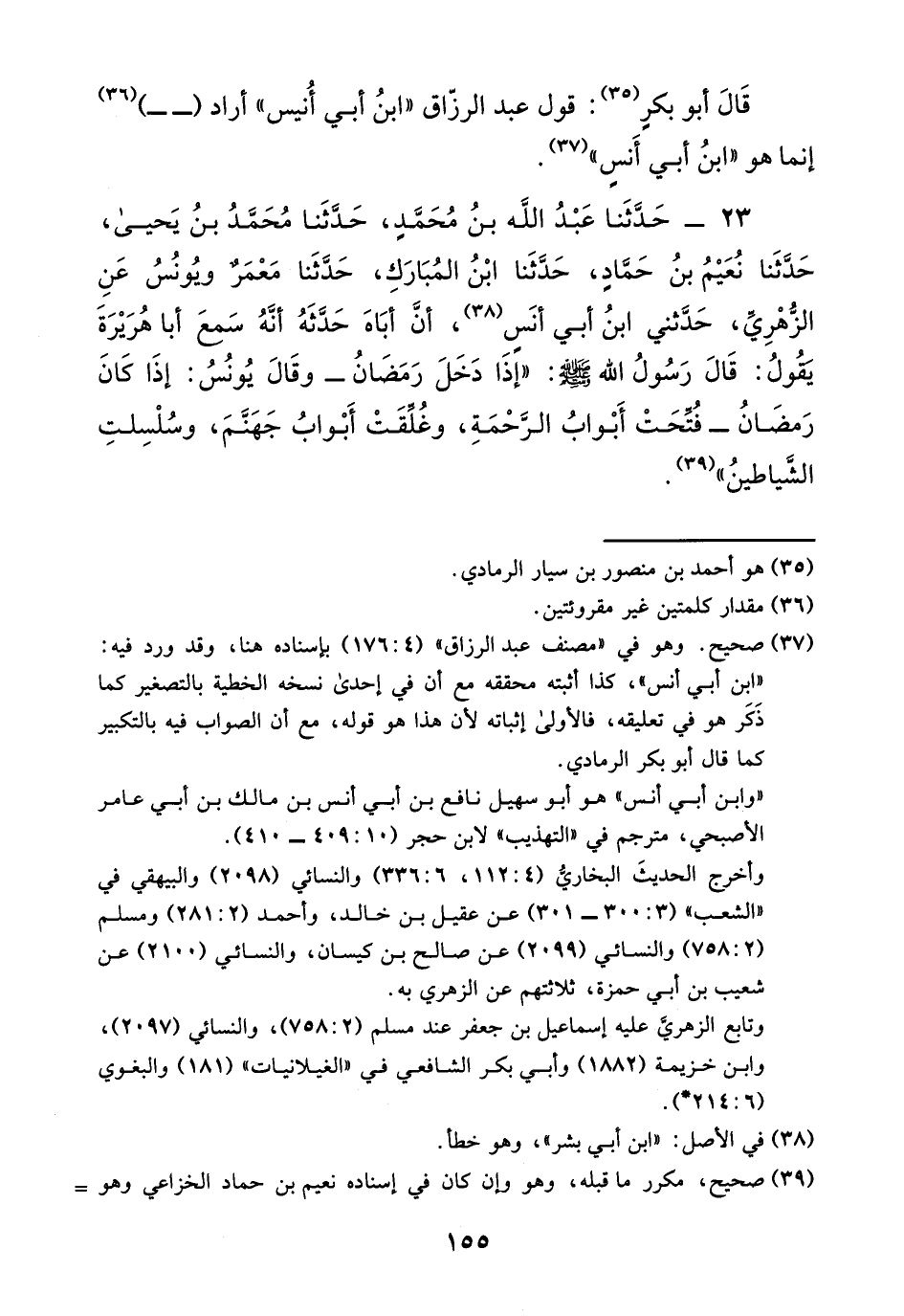 23- حَدَّثَنَا عَبْدُ اللَّهِ بْنُ مُحَمَّدٍ، حَدَّثَنَا مُحَمَّدُ بْنُ يَحْيَى، حَدَّثَنَا نُعَيْمُ بْنُ حَمَّادٍ، حَدَّثَنَا ابْنُ الْمُبَارَكِ، حَدَّثَنَا مَعْمَرٌ، وَيُونُسُ، عَنِ الزُّهْرِيِّ، حَدَّثَنِي ابْنُ أَبِي أَنَسٍ، أَنَّ أَبَاهُ حَدَّثَهُ أَنَّهُ سَمِعَ أَبَا هُرَيْرَةَ، يَقُولُ: قَالَ رَسُولُ اللَّهِ صَلَّى اللَّهُ عَلَيْهِ وَسَلَّمَ: §إِذَا دَخَلَ رَمَضَانَ - وَقَالَ يُونُسُ: إِذَا كَانَ رَمَضَانُ - فُتِحَتْ أَبْوَابُ الرَّحْمَةِ، وَغُلِّقَتْ أَبْوَابُ جَهَنَّمَ، وَسُلْسِلَتِ الشَّيَاطِينُ.
