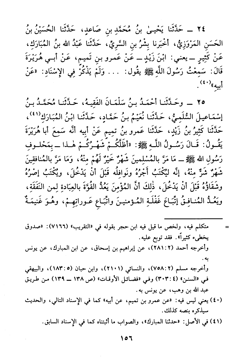 25- وَحَدَّثَنَا أَحْمَدُ بْنُ سَلْمَانَ الْفَقِيهُ، حَدَّثَنَا مُحَمَّدُ بْنُ إِسْمَاعِيلَ السُّلَمِيُّ، حَدَّثَنَا نُعَيْمُ بْنُ حَمَّادٍ، حَدَّثَنَا ابْنُ الْمُبَارَكِ، حَدَّثَنَا كَثِيرُ بْنُ زَيْدٍ، حَدَّثَنَا عَمْرُو بْنُ تَمِيمٍ، عَنْ أَبِيهِ، أَنَّهُ سَمِعَ أَبَا هُرَيْرَةَ، يَقُولُ: قَالَ رَسُولُ اللَّهِ صَلَّى اللَّهُ عَلَيْهِ وَسَلَّمَ: §أَظَلَّكُمْ شَهْرُكُمْ هَذَا بِمَحْلُوفِ رَسُولِ اللَّهِ صَلَّى اللَّهُ عَلَيْهِ وَسَلَّمَ، مَا مَرَّ بِالْمُسْلِمِينَ شَهْرٌ خَيْرٌ لَهُمْ مِنْهُ، وَمَا مَرَّ بِالْمُنَافِقِينَ شَهْرٌ شَرٌّ مِنْهُ، إِنَّهُ لِيَكْتُبُ أَجْرُهُ وَنَوَافِلُهُ قَبْلَ أَنْ يَدْخُلَ، وَيُكْتَبُ إِصْرُهُ وَشَقَاؤُهُ قَبْلَ أَنْ يَدْخُلَ، ذَلِكَ أَنَّ الْمُؤْمِنَ يُعِدُّ الْقُوَّةَ بِالْعِبَادَةِ لِمَنِ النَّفَقَةُ، وَيُعِدُّ الْمُنَافِقُ اتِّبَاعَ غَفْلَةِ الْمُؤْمِنِينَ، وَاتِّبَاعَ عَوْرَاتِهِمْ، وَهُوَ غَنِيمَةٌ -[157]- لِلْمُؤْمِنِ، يُغْنِمُهُ اللَّهُ عَزَّ وَجَلَّ أَجْرَهُ.