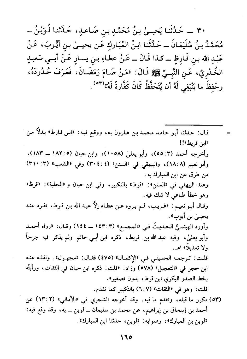 30- حَدَّثَنَا يَحْيَى بْنُ مُحَمَّدِ بْنِ صَاعِدٍ، حَدَّثَنَا لُوَيْنٌ مُحَمَّدُ بْنُ سُلَيْمَانَ، حَدَّثَنَا ابْنُ الْمُبَارَكِ، عَنْ يَحْيَى بْنِ أَيُّوبَ، عَنْ عَبْدِ اللَّهِ بْنِ قَارِظٍ - كَذَا قَالَ - عَنْ عَطَاءِ بْنِ يَسَارٍ، عَنْ أَبِي سَعِيدٍ الْخُدْرِيِّ، عَنِ النَّبِيِّ صَلَّى اللَّهُ عَلَيْهِ وَسَلَّمَ قَالَ: §مَنْ صَامَ رَمَضَانَ فَعَرَفَ حُدُودَهُ، وَحَفِظَ مَا يَنْبَغِي لَهُ أَنْ يُتَحَفَّظَ كَانَ كَفَّارَةٌ لَهُ.