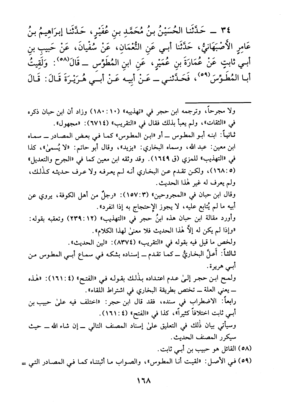 34- حَدَّثَنَا الْحُسَيْنُ بْنُ مُحَمَّدِ بْنِ عُفَيْرٍ، حَدَّثَنَا إِبْرَاهِيمُ بْنُ عَامِرٍ الْأَصْبَهَانِيُّ، حَدَّثَنَا أَبِي، عَنِ النُّعْمَانِ، عَنْ سُفْيَانَ، عَنْ حَبِيبِ بْنِ أَبِي ثَابِتٍ، عَنْ عُمَارَةَ بْنِ عُمَيْرٍ، عَنِ ابْنِ الْمُطَوِّسِ - قَالَ: وَلَقِيتُ أَنَا الْمُطَوِّسَ فَحَدَّثَنِي - عَنْ أَبِيهِ، عَنْ أَبِي هُرَيْرَةَ، قَالَ: قَالَ -[169]- رَسُولُ اللَّهِ صَلَّى اللَّهُ عَلَيْهِ وَسَلَّمَ: §مَنْ أَفْطَرَ يَوْمًا مِنْ رَمَضَانَ مِنْ غَيْرِ مَرِضٍ، وَلَا رُخْصَةٍ، فَلَا يَفِيهِ صِيَامُ الدَّهْرِ كُلِّهِ وَإِنْ صَامَهُ.