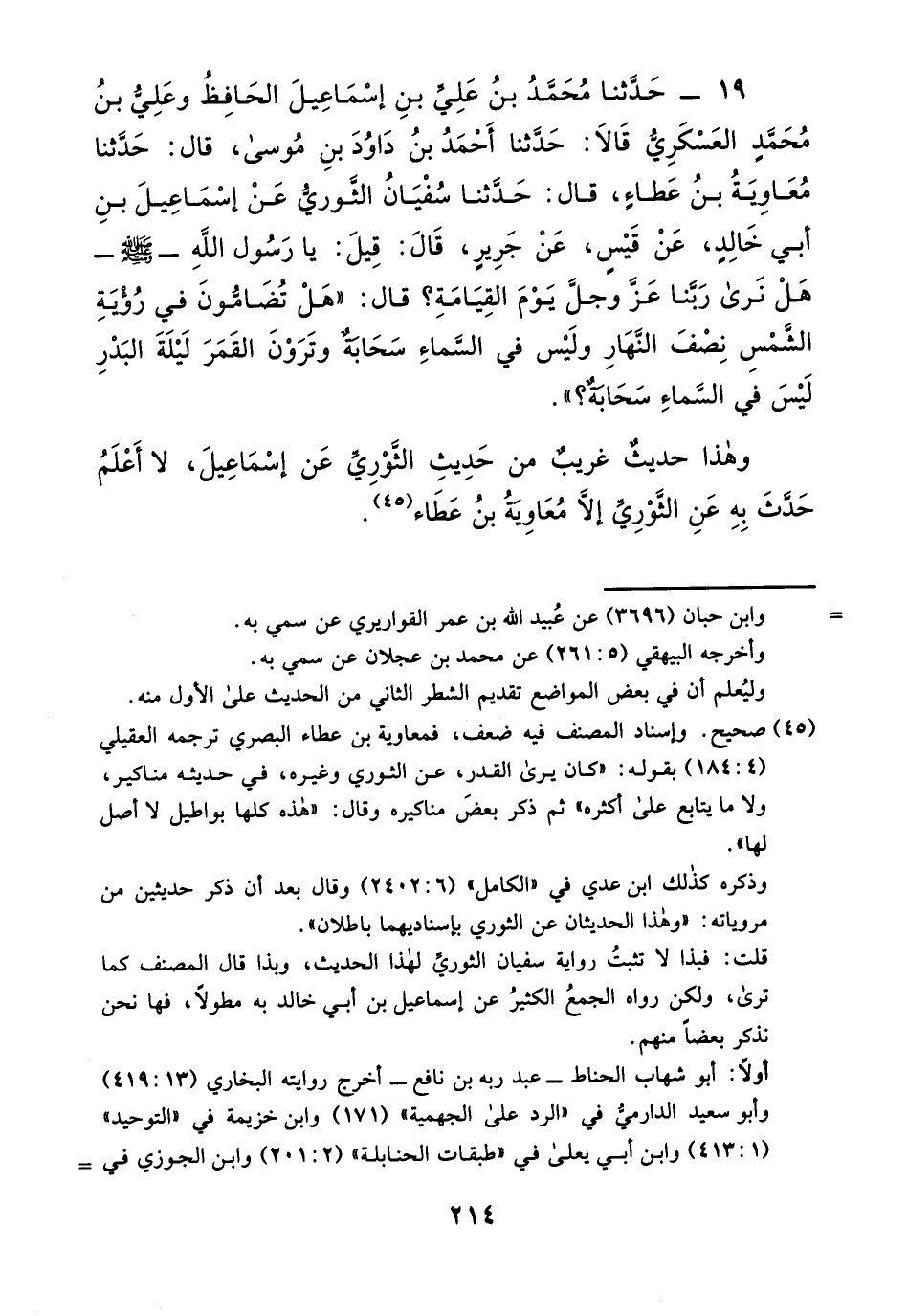 19- حَدَّثَنَا مُحَمَّدُ بْنُ عَلِيِّ بْنِ إِسْمَاعِيلَ الْحَافِظُ وَعَلِيُّ بْنُ مُحَمَّدٍ الْعَسْكَرِيُّ قَالا: حَدَّثَنَا أَحْمَدُ بْنُ دَاوُدَ بْنِ مُوسَى قَالَ حَدَّثَنَا مُعَاوِيَةُ بْنُ عَطَاءٍ قَالَ حَدَّثَنَا سُفْيَانُ الثَّوْرِيُّ عَنْ إِسْمَاعِيلَ بْنِ أَبِي خَالِدٍ عَنْ قَيْسٍ عَنْ جرير قال: قيل: يارسول اللَّهِ صَلَّى اللَّهُ عَلَيْهِ وَسَلَّمَ هَلْ نَرَى رَبَّنَا عَزَّ وَجَلَّ يَوْمَ الْقِيَامَةِ؟ قَالَ: " هَلْ تُضَامُّونَ فِي رُؤْيَةِ الشَّمْسِ نِصْفَ النَّهَارِ وَلَيْسَ فِي السَّمَاءِ سَحَابَةٌ وَتَرَوْنَ الْقَمَرَ لَيْلَةَ الْبَدْرِ لَيْسَ فِي السَّمَاءِ سَحَابَةٌ؟ ".