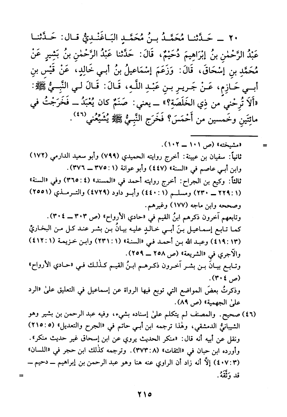 20- حَدَّثَنَا مُحَمَّدُ بْنُ مُحَمَّدٍ الْبَاغَنْدِيُّ قَالَ حَدَّثَنَا عَبْدُ الرَّحْمَنِ بْنُ إِبْرَاهِيمَ دُحَيْمٌ قَالَ حَدَّثَنَا عَبْدُ الرَّحْمَنِ بْنُ بَشِيرٍ عَنْ مُحَمَّدِ بْنِ إِسْحَاقَ قَالَ وَزَعَمَ إِسْمَاعِيلُ بْنِ أَبِي خَالِدٍ عَنْ قَيْسٍ بْنِ أَبِي حَازِمٍ عَنْ جَرِيرِ بْنِ عَبْدِ اللَّهِ قَالَ: قَالَ لِيَ النَّبِيُّ صَلَّى اللَّهُ عَلَيْهِ وَسَلَّمَ: " أَلا تُرِحْنِي مِنْ ذِي الخلصة؟ " يعني: صنم كَانَ يُعْبَدُ فَخَرَجْتُ فِي مِائَتَيْنِ وَخَمْسِينَ مِنْ أَحْمَسَ؟ فَخَرَجَ النَّبِيُّ صَلَّى اللَّهُ عَلَيْهِ وَسَلَّمَ يُشَيِّعُنِي.
