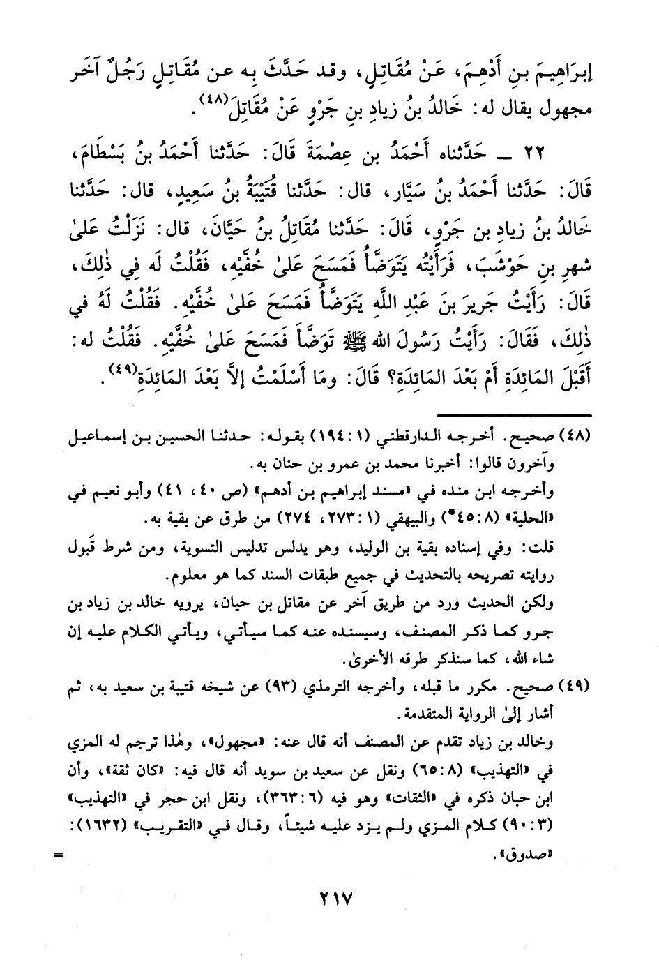 22- حَدَّثَنَاهُ أَحْمَدُ بْنُ عِصْمَةَ قَالَ حَدَّثَنَا أَحْمَدُ بْنُ بِسْطَامَ قَالَ حَدَّثَنَا أَحْمَدُ بْنُ سَيَّارٍ قَالَ حَدَّثَنَا قُتَيْبَةُ بْنُ سَعِيدٍ قَالَ حَدَّثَنَا خَالِدُ بْن زِيَادِ بْنِ جَرْوٍ قَالَ حَدَّثَنَا مُقَاتِلُ بْنُ حَيَّانَ قَالَ نَزَلْتُ عَلَى شَهْرِ بن حوشب فرأيته بتوضأ فَمَسَحَ عَلَى خُفَّيْهِ فَقُلْتُ لَهُ فِي ذَلِكَ قَالَ: رَأَيْتُ جَرِيرَ بْنَ عَبْدِ اللَّهِ يَتَوَضَّأُ فَمَسَحَ عَلَى خُفَّيْهِ فَقُلْتُ لَهُ فِي ذَلِكَ فَقَالَ: رَأَيْتُ رَسُولَ اللَّهِ صَلَّى اللَّهُ عَلَيْهِ وَسَلَّمَ تَوَضَّأَ فَمَسَحَ عَلَى خُفَّيْهِ فَقُلْتُ لَهُ: أَقَبْلَ الْمَائِدَةِ أَمْ بَعْدَ الْمَائِدَةِ؟ قَالَ: وَمَا أَسْلَمْتُ إِلا بَعْدَ الْمَائِدَةِ.