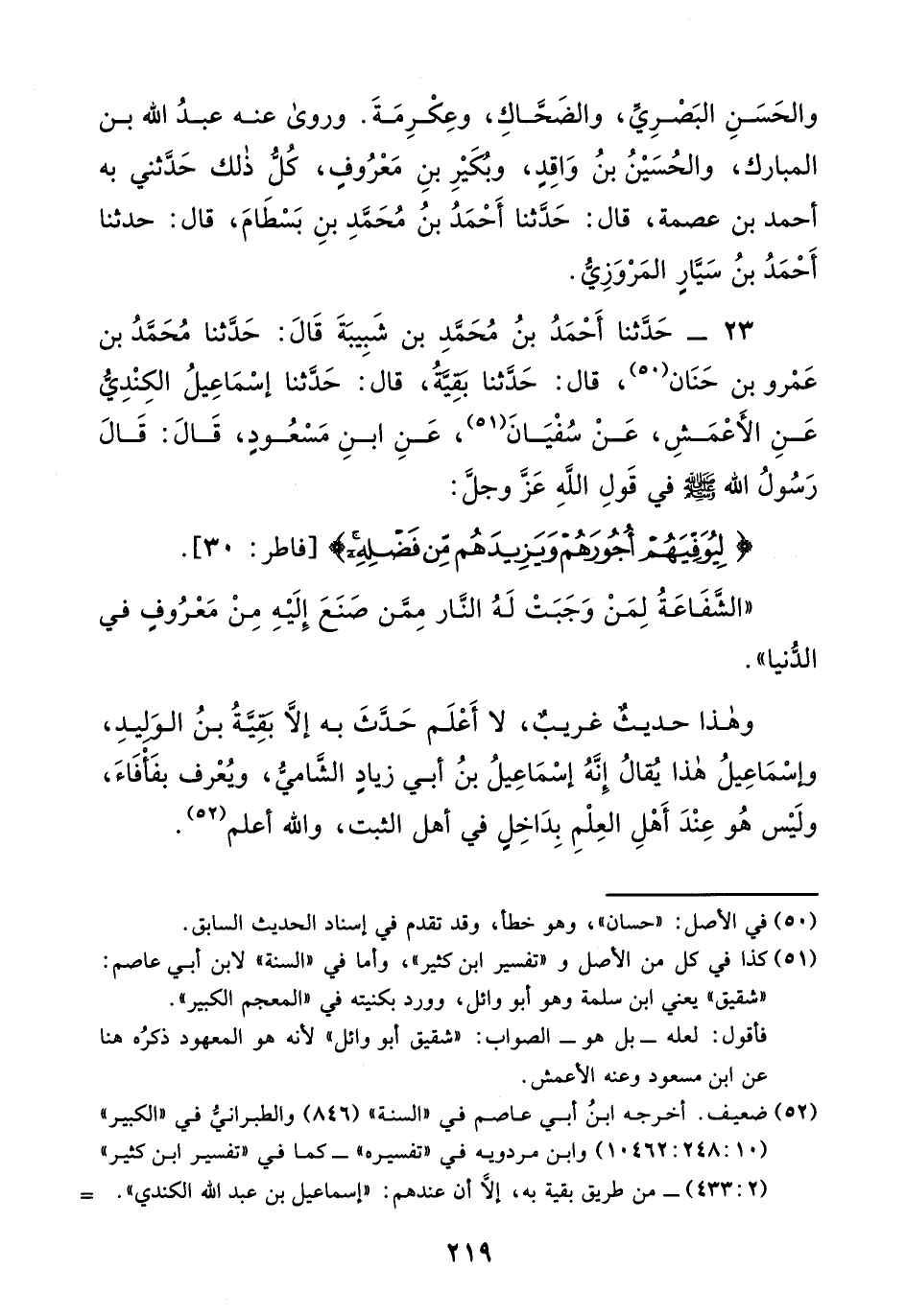 23- حَدَّثَنَا أَحْمَدُ بْنُ مُحَمَّدِ بْنِ شَبِيبَةَ قَالَ حَدَّثَنَا مُحَمَّدُ بْنُ عَمْرِو بْنِ حَنَانٍ قَالَ حَدَّثَنَا بَقِيَّةُ قَالَ حَدَّثَنَا إِسْمَاعِيلُ الْكِنْدِيُّ عَنِ الأَعْمَشِ عَنْ سُفْيَانَ عَنِ ابْنِ مَسْعُودٍ قَالَ قَالَ رَسُولُ اللَّهِ صَلَّى اللَّهُ عَلَيْهِ وَسَلَّمَ فِي قَوْلِ اللَّهِ عَزَّ وَجَلَّ: {لِيُوَفِّيَهُمْ أُجُورَهُمْ وَيَزِيدَهُمْ مِنْ فَضْلِهِ}