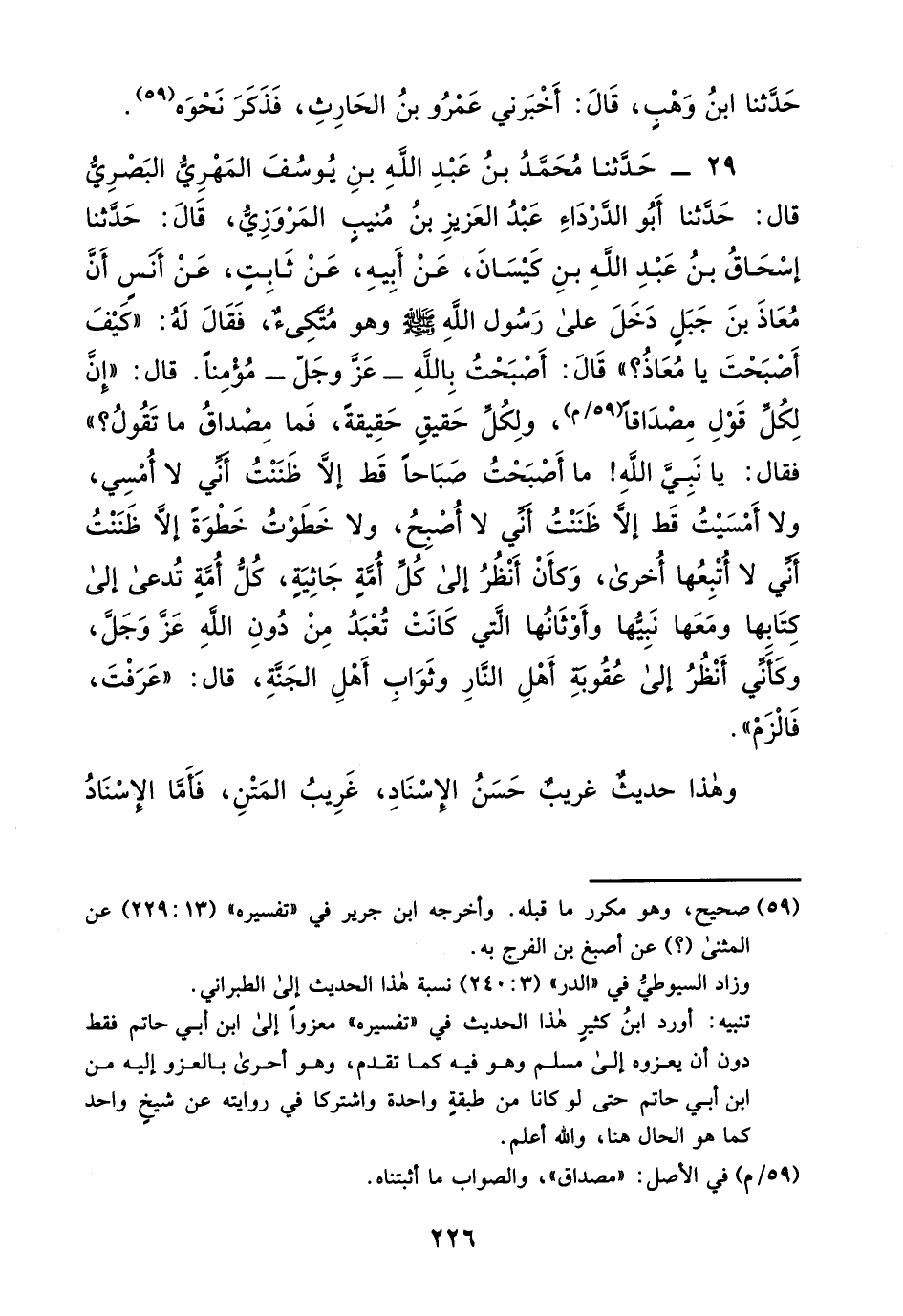 29- حَدَّثَنَا مُحَمَّدُ بْنُ عَبْدِ اللَّهِ بْنِ يُوسُفَ الْمَهْرِيُّ الْبَصْرِيُّ قَالَ حَدَّثَنَا أَبُو الدَّرْدَاءِ عَبْدُ الْعَزِيزِ بْنُ مُنِيبٍ الْمَرْوَزِيُّ قَالَ حَدَّثَنَا إِسْحَاقُ بْنُ عَبْدِ اللَّهِ بْنِ كَيْسَانَ عَنْ أَبِيهِ عَنْ ثَابِتٍ عَنْ أَنَسٍ أَنَّ مُعَاذَ بْنَ جَبَلٍ دَخَلَ عَلَى رَسُولِ اللَّهِ صَلَّى اللَّهُ عَلَيْهِ وَسَلَّمَ وَهُوَ متكيء فقال له: " كيف اصبحت يامعاذ؟ " قَالَ: أَصْبَحْتُ بِاللَّهِ عَزَّ وَجَلَّ مُؤْمِنًا. قَالَ: " إِنَّ لِكُلِّ قَوْلٍ مِصْدَاقًا وَلِكُلِّ حَقِيقٍ حَقِيقَةً فَمَا مصداق ما تقول؟ " فقال: يانبي اللَّهِ! مَا أَصْبَحْتُ صَبَاحًا قَطُّ إِلا ظَنَنْتُ أَنِّي لا أُمْسِي وَلا أَمْسَيْتُ قَطُّ إِلا ظَنَنْتُ أَنِّي لا أُصْبِحُ وَلا خَطَوْتُ خُطْوَةً إِلا ظَنَنْتُ أَنِّي لا أتبعها أخرى وكأن أَنْظُرُ إِلَى كُلِّ أُمَّةٍ جَاثِيَةٍ كُلُّ أُمَّةٍ تُدْعَى إِلَى كِتَابِهَا وَمَعَهَا نَبِيُّهَا وَأَوْثَانُهَا الَّتِي كَانَتْ تَعْبُدُ مِنْ دُونِ اللَّهِ عَزَّ وَجَلَّ وَكَأَنِّي أَنْظُرُ إِلَى عُقُوبَةِ أَهْلِ النَّارِ وَثَوَابِ أَهْلِ الْجَنَّةِ قال: " عرفت فالزم ".