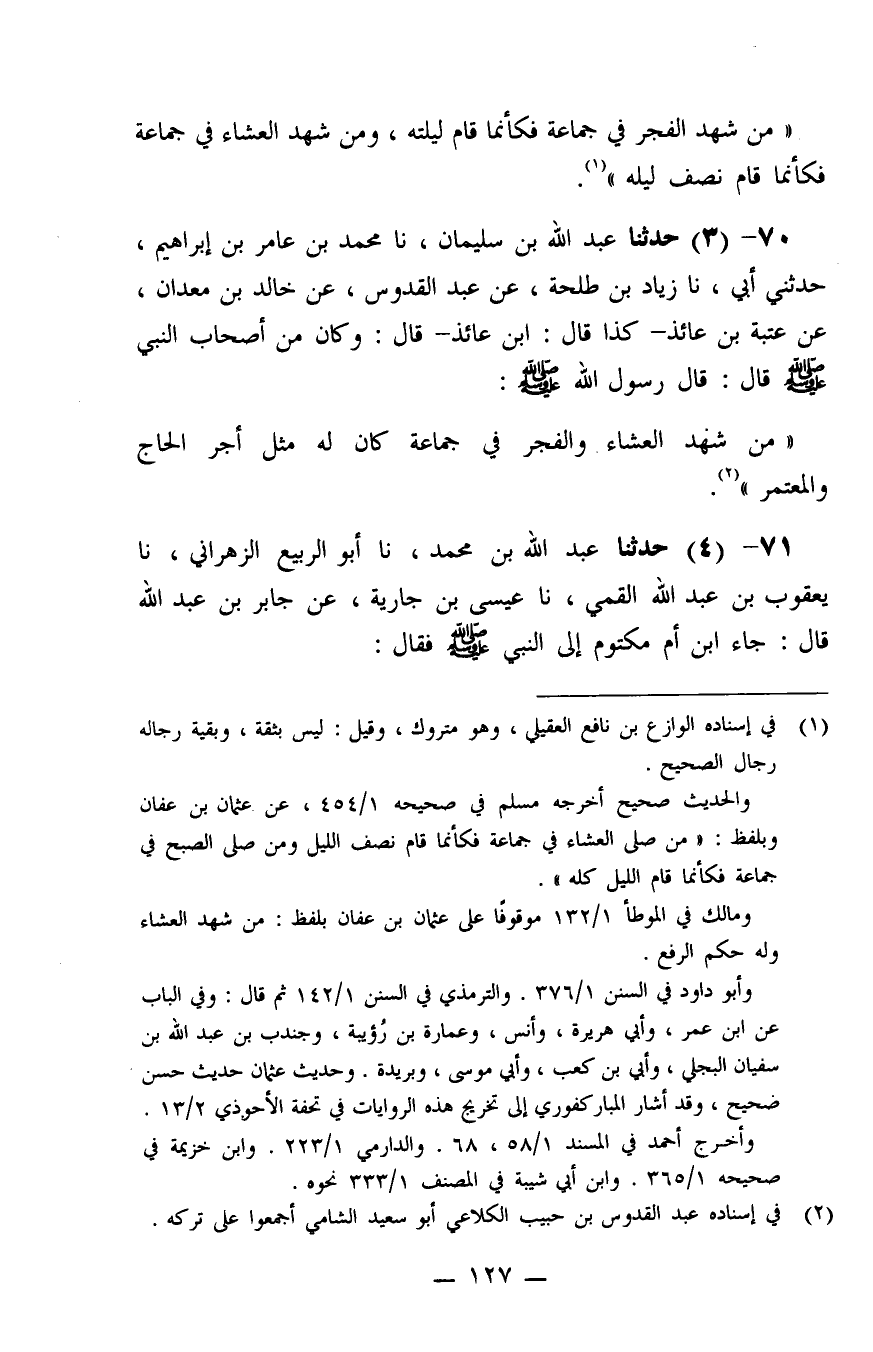 70 - حَدَّثَنَا عَبْدُ اللَّهِ بْنُ سُلَيْمَانَ، نا مُحَمَّدُ بْنُ عَامِرِ بْنِ إِبْرَاهِيمَ، حَدَّثَنِي أَبِي، نا زِيَادُ بْنُ طَلْحَةَ، عَنْ عَبْدِ الْقُدُّوسِ، عَنْ خَالِدِ بْنِ مَعْدَانَ، عَنْ عُتْبَةَ بْنِ عَائِذٍ، كَذَا قَالَ ابْنُ عَائِذٍ، قَالَ: وَكَانَ مِنْ أَصْحَابِ النَّبِيِّ صَلَّى اللَّهُ عَلَيْهِ وَسَلَّمَ، قَالَ: قَالَ رَسُولُ اللَّهِ صَلَّى اللَّهُ عَلَيْهِ وَسَلَّمَ: «مَنْ شَهِدَ الْعِشَاءَ وَالْفَجْرَ فِي جَمَاعَةٍ كَانَ لَهُ مِثْلُ أَجْرِ الْحَاجِّ وَالْمُعْتَمِرِ»