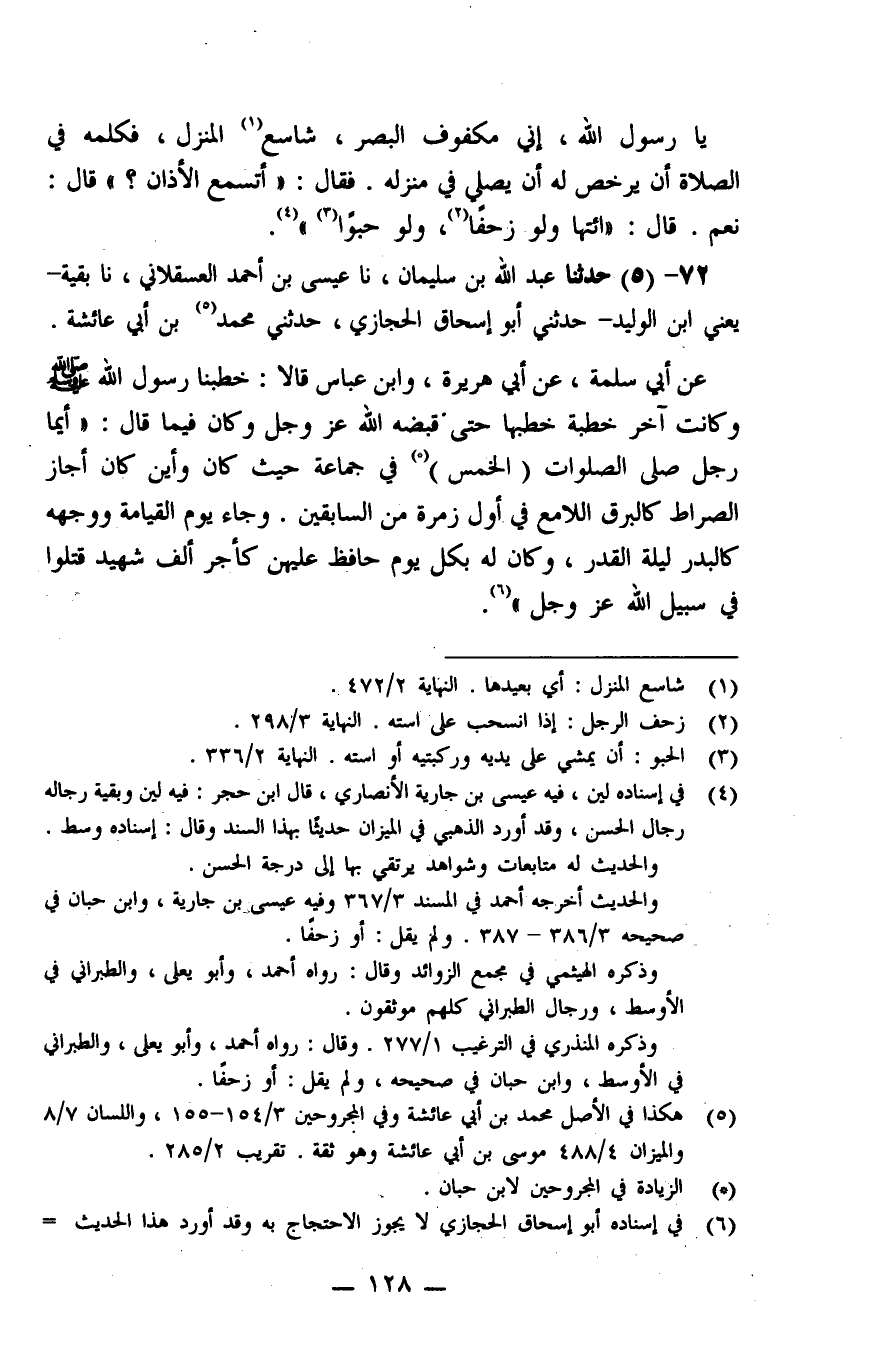 72 - حَدَّثَنَا عَبْدُ اللَّهِ بْنُ سُلَيْمَانَ، نا عِيسَى بْنُ أَحْمَدَ الْعَسْقَلَانِيُّ، نا بَقِيَّةُ يَعْنِي ابْنَ الْوَلِيدِ، حَدَّثَنِي أَبُو إِسْحَاقَ الْحِجَازِيُّ، حَدَّثَنِي مُحَمَّدُ بْنُ أَبِي عَائِشَةَ، عَنْ أَبِي سَلَمَةَ، عَنْ أَبِي هُرَيْرَةَ، وَابْنِ عَبَّاسٍ، قَالَا: خَطَبَنَا رَسُولُ اللَّهِ صَلَّى اللَّهُ عَلَيْهِ وَسَلَّمَ وَكَانَتْ آخِرَ خُطْبَةٍ خَطَبَهَا حَتَّى قَبَضَهُ اللَّهُ عَزَّ وَجَلَّ وَكَانَ فِيمَا قَالَ: «أَيُّمَا رَجُلٍ صَلَّى الصَّلَوَاتِ الْخَمْسِ فِي جَمَاعَةٍ حَيْثُ كَانَ وَأَيْنَ كَانَ أَجَازَ الصِّرَاطَ كَالْبَرْقِ اللَّامِعِ فِي أَوَّلِ زُمْرَةٍ مِنَ السَّابِقِينَ وَجَاءَ يَوْمَ الْقِيَامَةِ وَوَجْهُهُ كَالْبَدْرِ لَيْلَةَ الْقَدْرِ، وَكَانَ لَهُ بِكُلِّ يَوْمٍ حَافَظَ عَلَيْهِنَّ كَأَجْرِ أَلْفِ شَهِيدٍ قُتِلُوا فِي سَبِيلِ اللَّهِ عَزَّ وَجَلَّ»