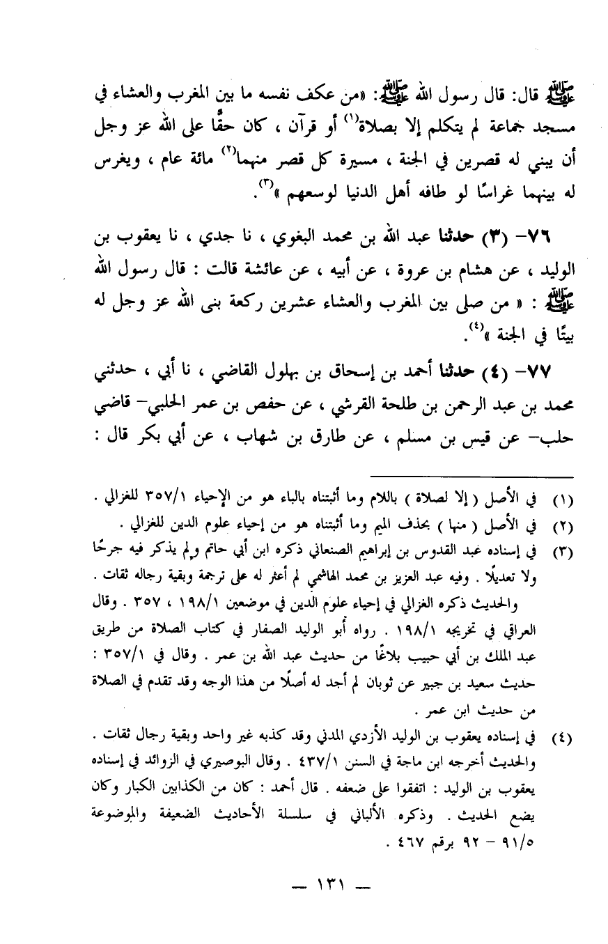 77 - حَدَّثَنَا أَحْمَدُ بْنُ إِسْحَاقَ بْنِ بُهْلُولٍ الْقَاضِي، نا أَبِي، حَدَّثَنِي مُحَمَّدُ بْنُ عَبْدِ الرَّحْمَنِ بْنِ طَلْحَةَ الْقُرَشِيُّ، عَنْ حَفْصِ بْنِ عُمَرَ الْحَلَبِيِّ - قَاضِي حَلَبَ، - عَنْ قَيْسِ بْنِ مُسْلِمٍ، عَنْ طَارِقِ بْنِ شِهَابٍ، عَنْ أَبِي بَكْرٍ، قَالَ: #132# سَمِعْتُ رَسُولَ اللَّهِ صَلَّى اللَّهُ عَلَيْهِ وَسَلَّمَ يَقُولُ: «مَنْ صَلَّى الْمَغْرِبَ وَصَلَّى مِنْ بَعْدِهَا رَكْعَتَيْنِ قَبْلَ أَنْ يَتَكَلَّمَ، أَسْكَنَهُ اللَّهُ عَزَّ وَجَلَّ فِي حَظِيرَةِ الْقُدُسِ»، قُلْتُ: فَإِنْ صَلَّى بَعْدَهَا أَرْبَعًا؟ قَالَ: «كَمَنْ حَجَّ حَجَّةً بَعْدَ حَجَّةٍ». قُلْتُ: فَإِنْ صَلَّى بَعْدَهَا سِتًّا؟ قَالَ: «يَغْفِرُ اللَّهُ لَهُ ذُنُوبَ خَمْسِينَ عَامًا»