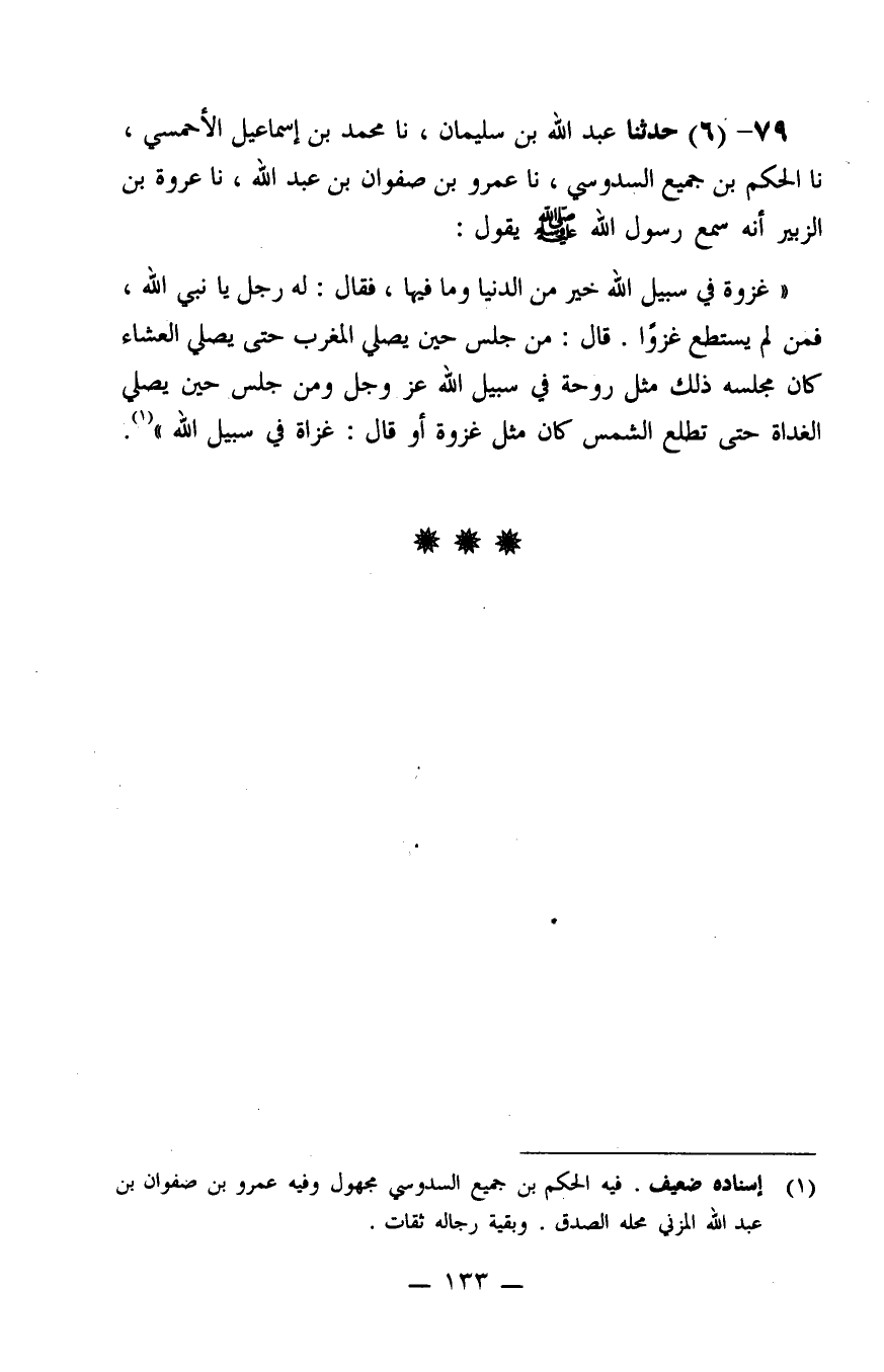 79 - حَدَّثَنَا عَبْدُ اللَّهِ بْنُ سُلَيْمَانَ، نا مُحَمَّدُ بْنُ إِسْمَاعِيلَ الْأَحْمَسِيُّ، نا الْحَكَمُ بْنُ جُمَيْعٍ السَّدُوسِيُّ، نا عَمْرُو بْنُ صَفْوَانَ بْنِ عَبْدِ اللَّهِ، نا عُرْوَةُ بْنُ الزُّبَيْرِ، أَنَّهُ سَمِعَ رَسُولَ اللَّهِ صَلَّى اللَّهُ عَلَيْهِ وَسَلَّمَ يَقُولُ: «غَزْوَةٌ فِي سَبِيلِ اللَّهِ خَيْرٌ مِنَ الدُّنْيَا وَمَا فِيهَا»، فَقَالَ لَهُ رَجُلٌ: يَا نَبِيَّ اللَّهِ، فَمَنْ لَمْ يَسْتَطِعْ غَزْوًا. قَالَ: مَنْ جَلَسَ حِينَ يُصَلِّي المغرب حتى يصلي الْعِشَاءَ كَانَ مَجْلِسُهُ ذَلِكَ مِثْلَ رَوْحَةٍ فِي سَبِيلِ اللَّهِ عَزَّ وَجَلَّ وَمَنْ جَلَسَ حِينَ يُصَلِّي الْغَدَاةَ حَتَّى تَطْلُعَ الشَّمْسُ كَانَ مِثْلَ غَزْوَةٍ أَوْ قَالَ: غَزَاةٍ فِي سَبِيلِ اللَّهِ "