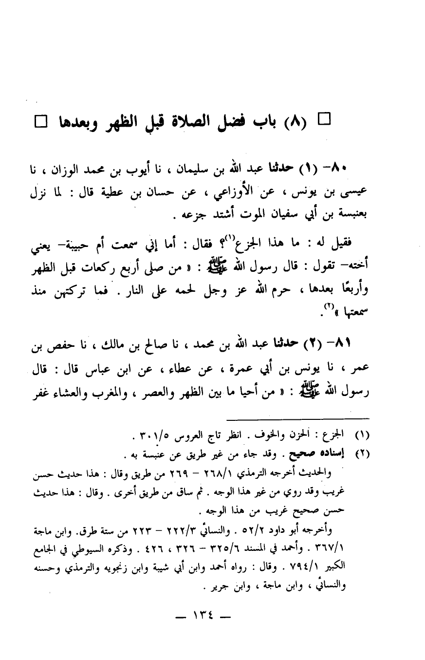 80 - حَدَّثَنَا عَبْدُ اللَّهِ بْنُ سُلَيْمَانَ، نا أَيُّوبُ بْنُ مُحَمَّدٍ الْوَزَّانُ، نا عِيسَى بْنُ يُونُسَ، عَنِ الْأَوْزَاعِيِّ، عَنْ حَسَّانَ بْنِ عَطِيَّةَ، قَالَ: لَمَّا نَزَلَ بِعَنْبَسَةَ بْنِ أَبِي سُفْيَانَ الْمَوْتُ اشْتَدَّ جَزَعُهُ. فَقِيلَ لَهُ: مَا هَذَا الْجَزَعُ؟ فَقَالَ: أَمَا إِنِّي سَمِعْتُ أُمَّ حَبِيبَةَ، يَعْنِي أُخْتَهُ تَقُولُ: قَالَ رَسُولُ اللَّهِ صَلَّى اللَّهُ عَلَيْهِ وَسَلَّمَ: «مَنْ صَلَّى أَرْبَعَ رَكَعَاتٍ قَبْلَ الظُّهْرِ وَأَرْبَعًا بَعْدَهَا، حَرَّمَ اللَّهُ عَزَّ وَجَلَّ لَحْمَهُ عَلَى النَّارِ. فَمَا تَرَكْتُهُنَّ مُنْذُ سَمِعْتُهَا»