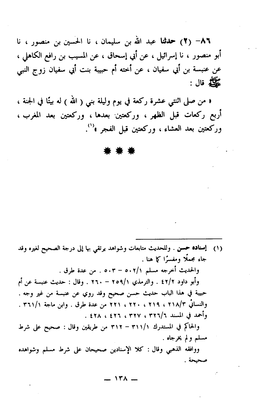 86 - حَدَّثَنَا عَبْدُ اللَّهِ بْنُ سُلَيْمَانَ، نا الْحُسَيْنُ بْنُ مَنْصُورٍ، نا أَبُو مَنْصُورٍ، نا إِسْرَائِيلُ، عَنْ أَبِي إِسْحَاقَ، عَنِ الْمُسَيَّبِ بْنِ رَافِعٍ الْكَاهِلِيِّ، عَنْ عَنْبَسَةَ بْنِ أَبِي سُفْيَانَ، عَنْ أُخْتِهِ أُمِّ حَبِيبَةَ بِنْتِ أَبِي سُفْيَانَ، زَوْجِ النَّبِيِّ صَلَّى عَلَيْهِ وَسَلَّمَ قَالَ: «مَنْ صَلَّى اثْنَتَيْ عَشْرَةَ رَكْعَةً فِي يَوْمٍ وَلَيْلَةٍ بَنَى اللَّهُ لَهُ بَيْتًا فِي الْجَنَّةِ، أَرْبَعَ رَكَعَاتٍ قَبْلَ الظُّهْرِ، وَرَكْعَتَيْنِ بَعْدَهَا، وَرَكْعَتَيْنِ بَعْدَ الْمَغْرِبِ، وَرَكْعَتَيْنِ بَعْدَ الْعِشَاءِ، وَرَكْعَتَيْنِ قَبْلَ الْفَجْرِ»