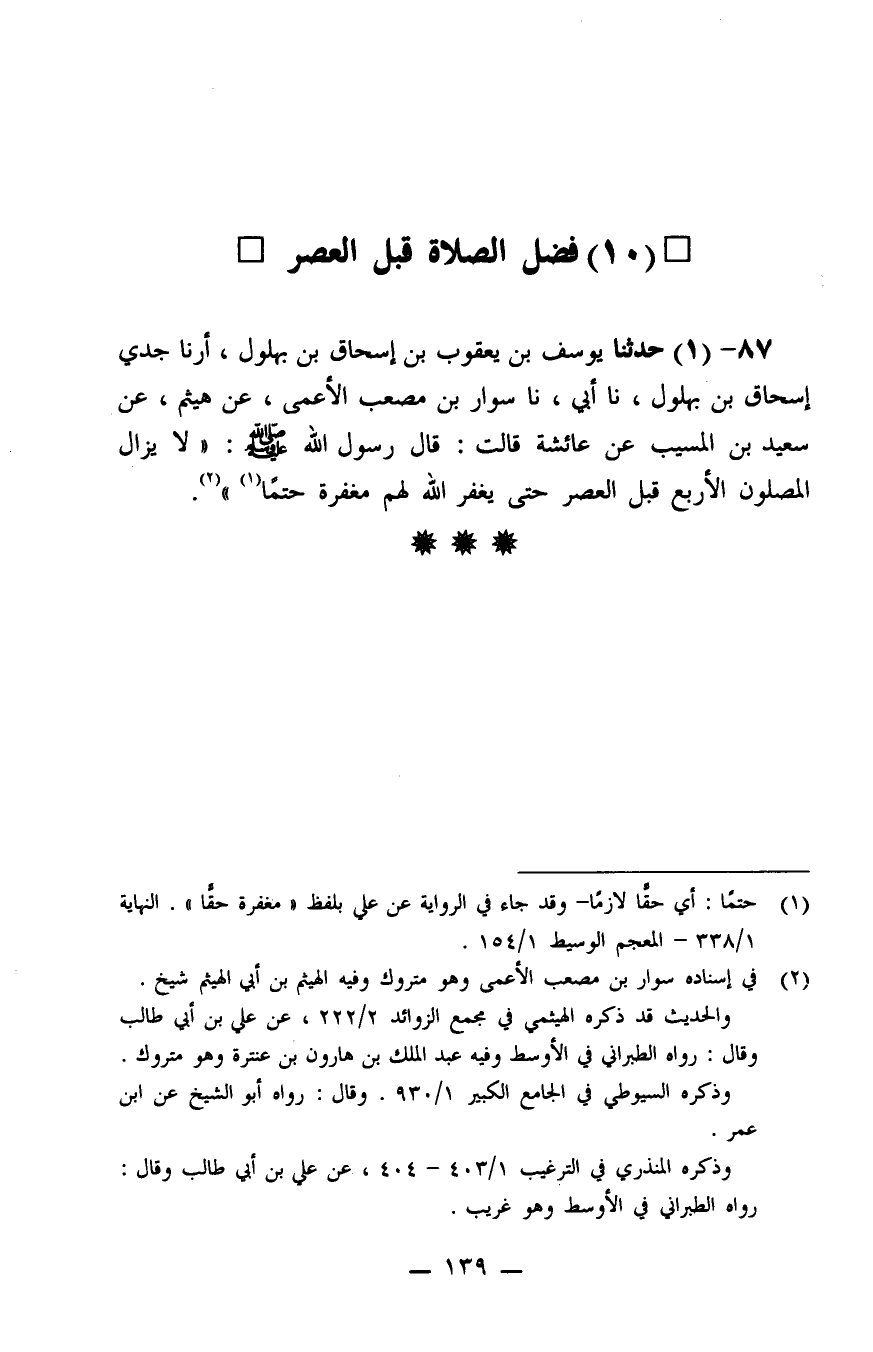 87 - حَدَّثَنَا يُوسُفُ بْنُ يَعْقُوبِ بْنِ إِسْحَاقَ بْنِ بُهْلُولٍ، أرنا جَدِّي إِسْحَاقُ بْنُ بُهْلُولٍ، نا أَبِي، نا سَوَّارُ بْنُ مُصْعَبٍ الْأَعْمَى، عَنْ هَيْثَمٍ، عَنْ سَعِيدِ بْنِ الْمُسَيِّبِ، عَنْ عَائِشَةَ، قَالَتْ: قَالَ رَسُولُ اللَّهِ صَلَّى اللَّهُ عَلَيْهِ وَسَلَّمَ: «لَا يَزَالُ الْمُصَلُّونَ الْأَرْبَعَ قَبْلَ الْعَصْرِ حَتَّى يَغْفِرَ اللَّهُ لَهُمْ مَغْفِرَةً حَتْمًا»