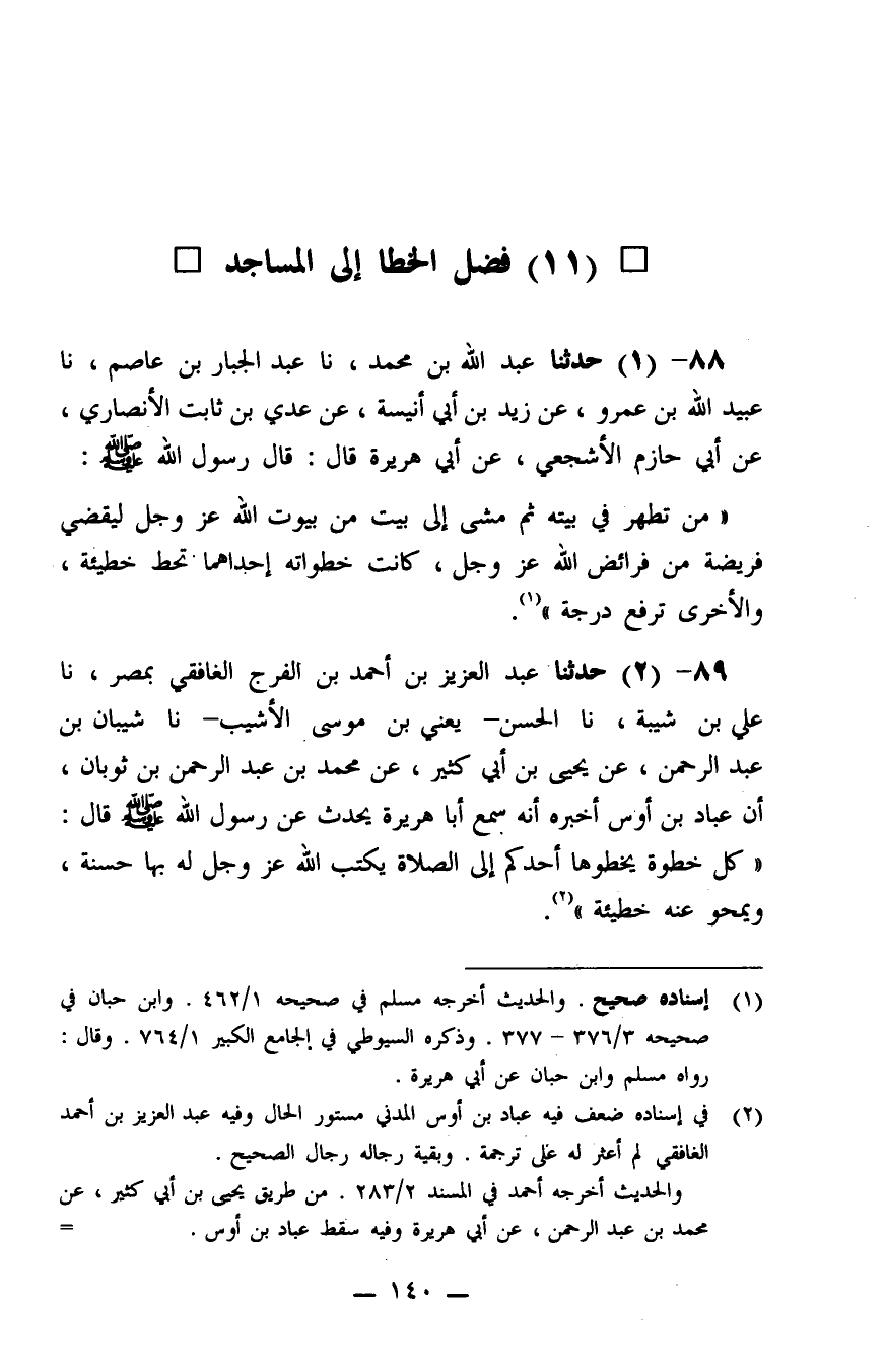 89 - حَدَّثَنَا عَبْدُ الْعَزِيزِ بْنُ أَحْمَدَ بْنِ الْفَرَجِ الْغَافِقِيُّ، بِمِصْرَ، نا عَلِيُّ بْنُ شَيْبَةَ، نا الْحَسَنُ يَعْنِي ابْنَ مُوسَى الْأَشْيَبَ، نا شَيْبَانُ بْنُ عَبْدِ الرَّحْمَنِ، عَنْ يَحْيَى بْنِ أَبِي كَثِيرٍ، عَنْ مُحَمَّدِ بْنِ عَبْدِ الرَّحْمَنِ بْنِ ثَوْبَانَ، أَنَّ عَبَّادَ بْنَ أَوْسٍ، أَخْبَرَهُ أَنَّهُ سَمِعَ أَبَا هُرَيْرَةَ، يُحَدِّثُ عَنْ رَسُولِ اللَّهِ صَلَّى اللَّهُ عَلَيْهِ وَسَلَّمَ قَالَ: «كُلُّ خُطْوَةٍ يَخْطُوهَا أَحَدُكُمْ إِلَى الصَّلَاةِ يَكْتُبُ اللَّهُ عَزَّ وَجَلَّ لَهُ بِهَا حَسَنَةً، وَيَمْحُو عَنْهُ خَطِيئَةً»
