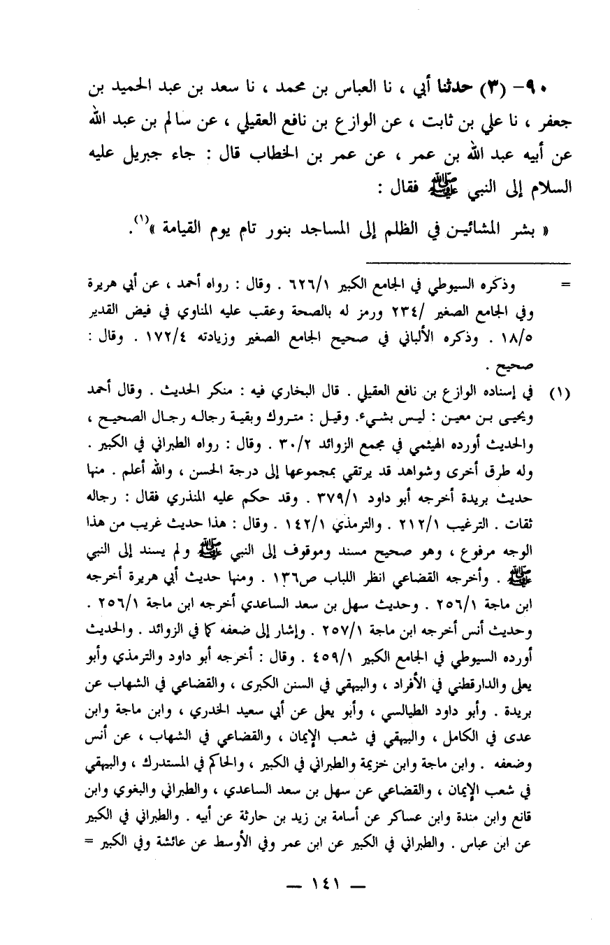 90 - حَدَّثَنَا أَبِي، نا الْعَبَّاسُ بْنُ مُحَمَّدٍ، نا سَعْدُ بْنُ عَبْدِ الْحَمِيدِ بْنِ جَعْفَرٍ، نا عَلِيُّ بْنُ ثَابِتٍ، عَنِ الْوَازِعِ بْنِ نَافِعٍ الْعُقَيْلِيِّ، عَنْ سَالِمِ بْنِ عَبْدِ اللَّهِ، عَنْ أَبِيهِ عَبْدِ اللَّهِ بْنِ عُمَرَ، عَنْ عُمَرَ بْنِ الْخَطَّابِ، قَالَ: جَاءَ جِبْرِيلُ عَلَيْهِ السَّلَامُ إِلَى النَّبِيِّ صَلَّى اللَّهُ عَلَيْهِ وَسَلَّمَ فَقَالَ: «بَشِّرِ الْمَشَّائِينَ فِي الظُّلْمِ إِلَى الْمَسَاجِدِ بِنُورٍ تَامٍّ يَوْمَ الْقِيَامَةِ»