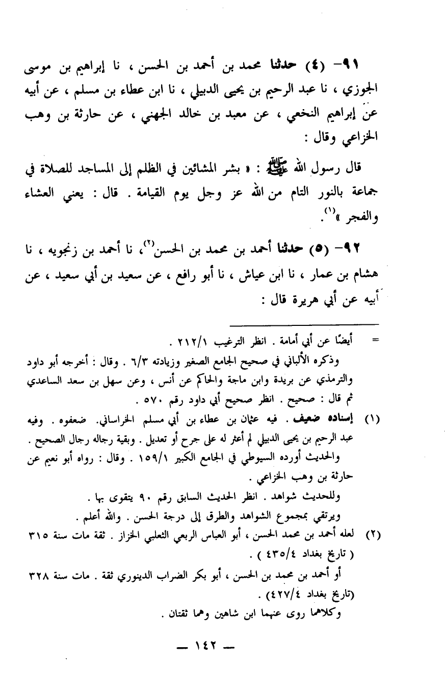 91 - حَدَّثَنَا مُحَمَّدُ بْنُ أَحْمَدَ بْنِ الْحَسَنِ، نا إِبْرَاهِيمُ بْنُ مُوسَى الْجَوْزِيُّ، نا عَبْدُ الرَّحِيمِ بْنُ يَحْيَى الدَّبِيلِيُّ، نا ابْنُ عَطَاءِ بْنِ مُسْلِمٍ، عَنْ أَبِيهِ، عَنْ إِبْرَاهِيمَ النَّخَعِيِّ، عَنْ مَعْبَدِ بْنِ خَالِدٍ الْجُهَنِيِّ، عَنْ حَارِثَةَ بْنِ وَهْبٍ الْخُزَاعِيِّ، وَقَالَ،: قَالَ رَسُولُ اللَّهِ صَلَّى اللَّهُ عَلَيْهِ وَسَلَّمَ: " بَشِّرِ الْمَشَّائِينَ فِي الظُّلَمِ إِلَى الْمَسَاجِدِ لِلصَّلَاةِ فِي جَمَاعَةٍ بِالنُّورِ التَّامِّ مِنَ اللَّهِ عَزَّ وَجَلَّ يَوْمَ الْقِيَامَةِ. قَالَ: يَعْنِي الْعِشَاءَ وَالْفَجْرَ "