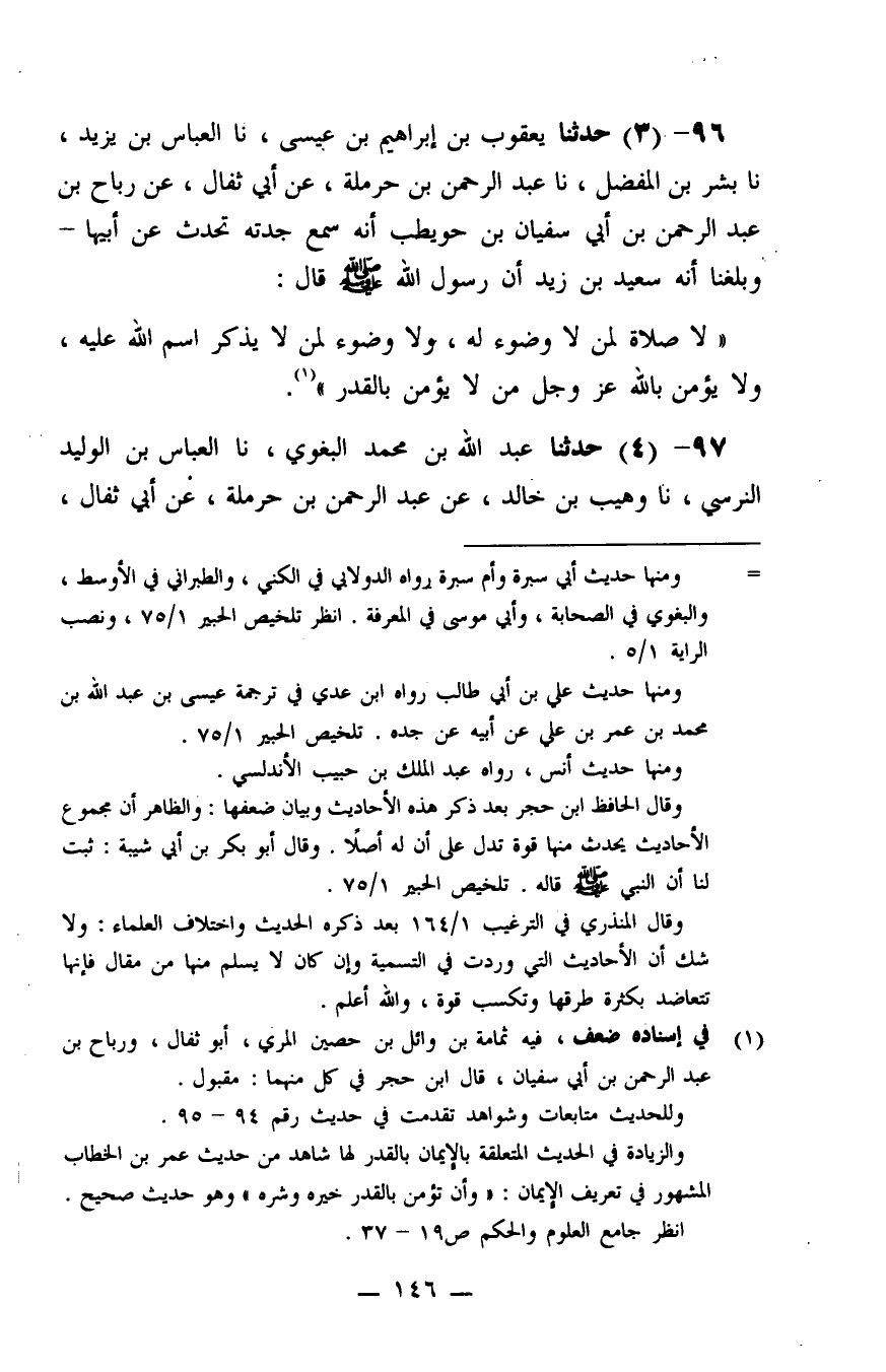 96 - حَدَّثَنَا يَعْقُوبُ بْنُ إِبْرَاهِيمَ بْنِ عِيسَى، نا الْعَبَّاسُ بْنُ يَزِيدَ، نا بِشْرُ بْنُ الْمُفَضَّلِ، نا عَبْدُ الرَّحْمَنِ بْنُ حَرْمَلَةَ، عَنْ أَبِي ثِفَالٍ، #147# عَنْ رَبَاحِ بْنِ عَبْدِ الرَّحْمَنِ بْنِ أَبِي سُفْيَانَ بْنِ حُوَيْطِبٍ، أَنَّهُ سَمِعَ جَدَّتَهُ، تُحَدِّثُ عَنْ أَبِيهَا، وَبَلَغَنَا، أَنَّهُ سَعِيدُ بْنُ زَيْدٍ أَنَّ رَسُولَ اللَّهِ صَلَّى اللَّهُ عَلَيْهِ وَسَلَّمَ قَالَ: «لَا صَلَاةَ لِمَنْ لَا وُضُوءَ لَهُ، وَلَا وُضُوءَ لِمَنْ لَا يَذْكُرُ اسْمَ اللَّهِ عَلَيْهِ، وَلَا يُؤْمِنُ بِاللَّهِ عَزَّ وَجَلَّ مَنْ لَا يُؤْمِنُ بِالْقَدَرِ»
