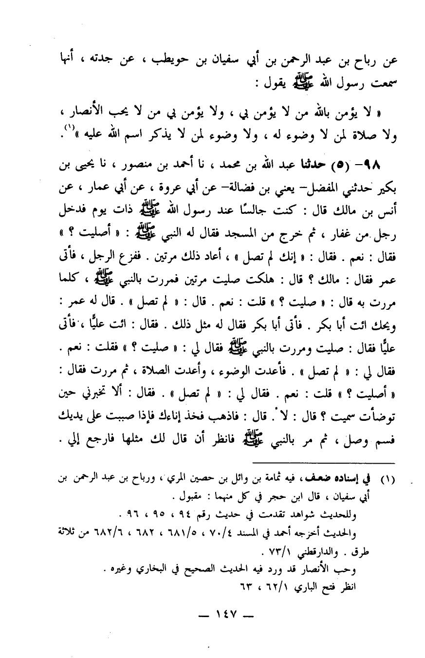 98 - حَدَّثَنَا عَبْدُ اللَّهِ بْنُ مُحَمَّدٍ، نا أَحْمَدُ بْنُ مَنْصُورٍ، نا يَحْيَى بْنُ بُكَيْرٍ، حَدَّثَنِي الْمُفَضَّلُ يَعْنِي ابْنَ فَضَالَةَ، عَنْ أَبِي عُرْوَةَ، عَنْ أَبِي عَمَّارٍ، عَنْ أَنَسِ بْنِ مَالِكٍ، قَالَ: كُنْتُ جَالِسًا عِنْدَ رَسُولِ اللَّهِ صَلَّى اللَّهُ عَلَيْهِ وَسَلَّمَ ذَاتَ يَوْمٍ فَدَخَلَ رَجُلٌ مِنْ غِفَارَ، ثُمَّ خَرَجَ مِنَ الْمَسْجِدِ فَقَالَ لَهُ النَّبِيُّ صَلَّى اللَّهُ عَلَيْهِ وَسَلَّمَ: «أَصَلَّيْتَ؟» فَقَالَ: نَعَمْ. فَقَالَ: «إِنَّكَ لَمْ تُصَلِّ»، أَعَادَ ذَلِكَ مَرَّتَيْنِ. فَفَزِعَ الرَّجُلُ، فَأَتَى عُمَرَ فَقَالَ: مَا لَكَ؟ قَالَ: هَلَكْتُ صَلَّيْتُ مَرَّتَيْنِ فَمَرَرْتُ بِالنَّبِيِّ صَلَّى اللَّهُ عَلَيْهِ وَسَلَّمَ، كُلَّمَا مَرَرْتُ بِهِ قَالَ: «صَلَّيْتَ؟» قُلْتُ: نَعَمْ. قَالَ: «لَمْ تُصَلِّ». قَالَ لَهُ عُمَرُ: وَيْحَكَ ائْتِ أَبَا بَكْرٍ. فَأَتَى أَبَا بَكْرٍ فَقَالَ لَهُ مِثْلَ ذَلِكَ. فَقَالَ: ائْتِ عَلِيًّا، فَأَتَى عَلِيًّا فَقَالَ: صَلَّيْتُ وَمَرَرْتُ بِالنَّبِيِّ صَلَّى اللَّهُ عَلَيْهِ وَسَلَّمَ فَقَالَ لِي: «صَلَّيْتَ؟»، فَقُلْتُ: نَعَمْ. فَقَالَ لِي: «لَمْ تُصَلِّ». فَأَعَدْتُ الْوُضُوءَ، وَأَعَدْتُ الصَّلَاةَ، ثُمَّ مَرَرْتُ، فَقَالَ: «أَصَلَّيْتَ؟»، قُلْتُ نَعَمْ. فَقَالَ لِي: «لَمْ تُصَلِّ». فَقَالَ: أَلَا تُخْبِرُنِي حِينَ تَوَضَّأتَ سَمَّيْتَ؟، قَالَ: لَا. قَالَ: فَاذْهَبْ فَخُذْ إِنَاءَكَ فَإِذَا صَبَبْتَ عَلَى يَدَيْكَ فَسَمِّ وَصَلٍّ، ثُمَّ مُرَّ بِالنَّبِيِّ صَلَّى اللَّهُ عَلَيْهِ وَسَلَّمَ فَانْظُرْ إِنْ قَالَ لَكَ مِثْلَهَا فَارْجِعْ إِلَيَّ. #148# فَذَهَبَ الرَّجُلُ فَتَوَضَّأَ فَسَمَّى فَلَمَّا صَلَّى خَرَجَ فَضَحِكَ النَّبِيُّ صَلَّى اللَّهُ عَلَيْهِ وَسَلَّمَ إِلَيْهِ، وَقَالَ لَهُ النَّبِيُّ صَلَّى اللَّهُ عَلَيْهِ وَسَلَّمَ: «الْآنَ حِينَ صَلَّيْتَ»