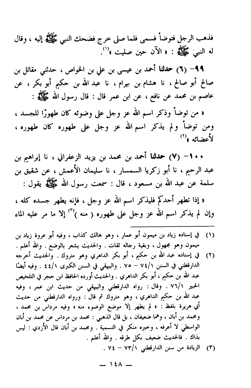 99 - حَدَّثَنَا أَحْمَدُ بْنُ عِيسَى بْنِ عَلِيِّ بْنِ الْخَوَّاصِ، حَدَّثَنِي مُقَاتِلُ بْنُ صَالِحٍ أَبُو صَالِحٍ، نا هِشَامُ بْنُ بَهْرَامَ، نا عَبْدُ اللَّهِ بْنُ حَكِيمٍ أَبُو بَكْرٍ، عَنْ عَاصِمِ بْنِ مُحَمَّدٍ، عَنْ نَافِعٍ، عَنِ ابْنِ عُمَرَ، قَالَ: قَالَ رَسُولُ اللَّهِ صَلَّى اللَّهُ عَلَيْهِ وَسَلَّمَ: «مَنْ تَوَضَّأَ وَذَكَرَ اسْمَ اللَّهِ عَزَّ وَجَلَّ عَلَى وُضُوئِهِ كَانَ طُهُورًا لِلْجَسَدِ، وَمَنْ تَوَضَّأَ وَلَمْ يَذْكُرِ اسْمَ اللَّهِ عَزَّ وَجَلَّ عَلَى طُهُورِهِ كَانَ طُهُورُهُ لِأَعْضَائِهِ»