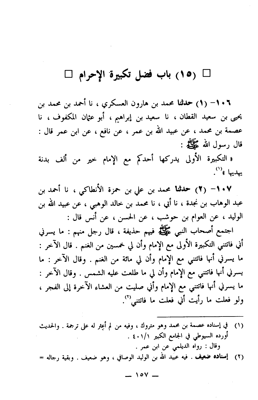 106 - حَدَّثَنَا مُحَمَّدُ بْنُ هَارُونَ الْعَسْكَرِيُّ، نا أَحْمَدُ بْنُ مُحَمَّدِ بْنِ يَحْيَى بْنِ سَعِيدٍ الْقَطَّانُ، نا سَعِيدُ بْنُ إِبْرَاهِيمَ أَبُو عُثْمَانَ الْمَكْفُوفُ، نا عِصْمَةُ بْنُ مُحَمَّدٍ، عَنْ عُبَيْدِ اللَّهِ بْنِ عُمَرَ، عَنْ نَافِعٍ، عَنِ ابْنِ عُمَرَ، قَالَ: قَالَ رَسُولُ اللَّهِ صَلَّى اللَّهُ عَلَيْهِ وَسَلَّمَ: «التَّكْبِيرَةُ الْأُولَى يُدْرِكُهَا أَحَدُكُمْ مَعَ الْإِمَامِ خَيْرٌ مِنْ أَلْفِ بَدَنَةٍ يُهْدِيَهَا»