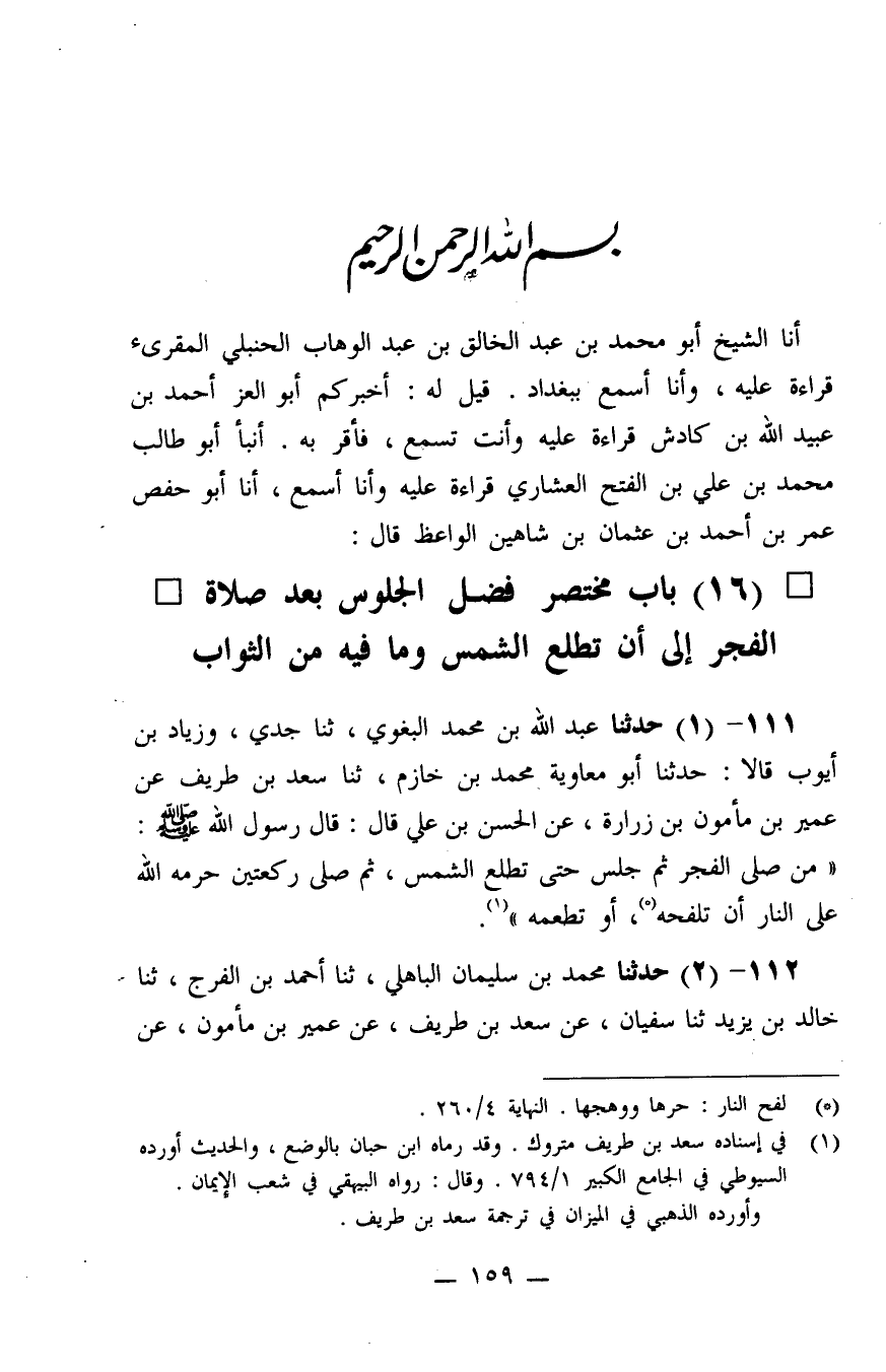111 - حَدَّثَنَا عَبْدُ اللَّهِ بْنُ مُحَمَّدٍ الْبَغَوِيُّ، ثنا جَدِّي، وَزِيَادُ بْنُ أَيُّوبَ، قَالَا: حَدَّثَنَا أَبُو مُعَاوِيَةَ مُحَمَّدُ بْنُ خَازِمٍ، ثنا سَعْدُ بْنُ طَرِيفٍ، عَنْ عُمَيْرِ بْنِ مَأمُونِ بْنِ زُرَارَةَ، عَنِ الْحَسَنِ بْنِ عَلِيٍّ، قَالَ: قَالَ رَسُولُ اللَّهِ صَلَّى اللَّهُ عَلَيْهِ وَسَلَّمَ: «مَنْ صَلَّى الْفَجْرَ ثُمَّ جَلَسَ حَتَّى تَطْلُعَ الشَّمْسُ، ثُمَّ صَلَّى رَكْعَتَيْنِ حَرَّمَهُ اللَّهُ عَلَى النَّارِ أَنْ تَلْفَحَهُ، أَوْ تَطْعَمَهُ»