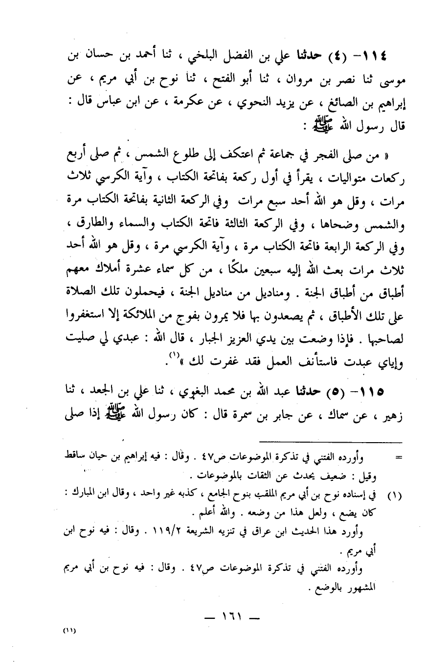 114 - حَدَّثَنَا عَلِيُّ بْنُ الْفَضْلِ الْبَلْخِيُّ، ثنا أَحْمَدُ بْنُ حَسَّانَ بْنِ مُوسَى، ثنا نَصْرُ بْنُ مَرْوَانَ، ثنا أَبُو الْفَتْحِ، ثنا نُوحُ بْنُ أَبِي مَرْيَمَ، عَنْ إِبْرَاهِيمَ بْنِ الصَّائِغِ، عَنْ يَزِيدَ النَّحْوِيِّ، عَنْ عِكْرِمَةَ، عَنِ ابْنِ عَبَّاسٍ، قَالَ: قَالَ رَسُولُ اللَّهِ صَلَّى اللَّهُ عَلَيْهِ وَسَلَّمَ: مَنْ صَلَّى الْفَجْرَ فِي جَمَاعَةٍ ثُمَّ اعْتَكَفَ إِلَى طُلُوعِ الشَّمْسِ، ثُمَّ صَلَّى أَرْبَعَ رَكَعَاتٍ مُتَوَالِيَاتٍ، يَقْرَأُ فِي أَوَّلِ رَكْعَةٍ بِفَاتِحَةِ الْكِتَابِ، وَآيَةِ الْكُرْسِيِّ ثَلَاثَ مَرَّاتٍ، وَقُلْ هُوَ اللَّهُ أَحَدٌ سَبْعَ مَرَّاتٍ، وَفِي الرَّكْعَةِ الثَّانِيَةِ بِفَاتِحَةِ الْكِتَابِ مَرَّةً وَالشَّمْسِ وَضُحَاهَا، وَفِي الرَّكْعَةِ الثَّالِثَةِ فَاتِحَةَ الْكِتَابِ وَالسَّمَاءِ وَالطَّارِقِ، وَفِي الرَّكْعَةِ الرَّابِعَةِ فَاتِحَةَ الْكِتَابِ مَرَّةً، وَآيَةَ الْكُرْسِيِّ مَرَّةً، وَقُلْ هُوَ اللَّهُ أَحَدٌ ثَلَاثَ مَرَّاتٍ بَعَثَ اللَّهُ إِلَيْهِ سَبْعِينَ مَلَكًا، مِنْ كُلِّ سَمَاءٍ عَشْرَةُ أَمْلَاكٍ مَعَهُمْ أَطْبَاقٌ مِنْ أَطْبَاقِ الْجَنَّةِ، وَمَنَادِيلُ مِنْ مَنَادِيلِ الْجَنَّةِ، فَيَحْمِلُونَ تِلْكَ الصَّلَاةَ عَلَى تِلْكَ الْأَطْبَاقِ، ثُمَّ يَصْعَدُونَ بِهَا فَلَا يَمُرُّونَ بِفَوْجٍ مِنَ الْمَلَائِكَةِ إِلَّا اسْتَغْفَرُوا لِصَاحِبِهَا. فَإِذَا وُضِعَتْ بَيْنَ يَدَيِ الْعَزِيزِ الْجَبَّارِ، قَالَ اللَّهُ: «عَبْدِي لِي صَلَّيْتَ وَإِيَّايَ عَبَدْتَ فَاسْتَانِفِ الْعَمَلَ فَقَدْ غَفَرْتُ لَكَ»