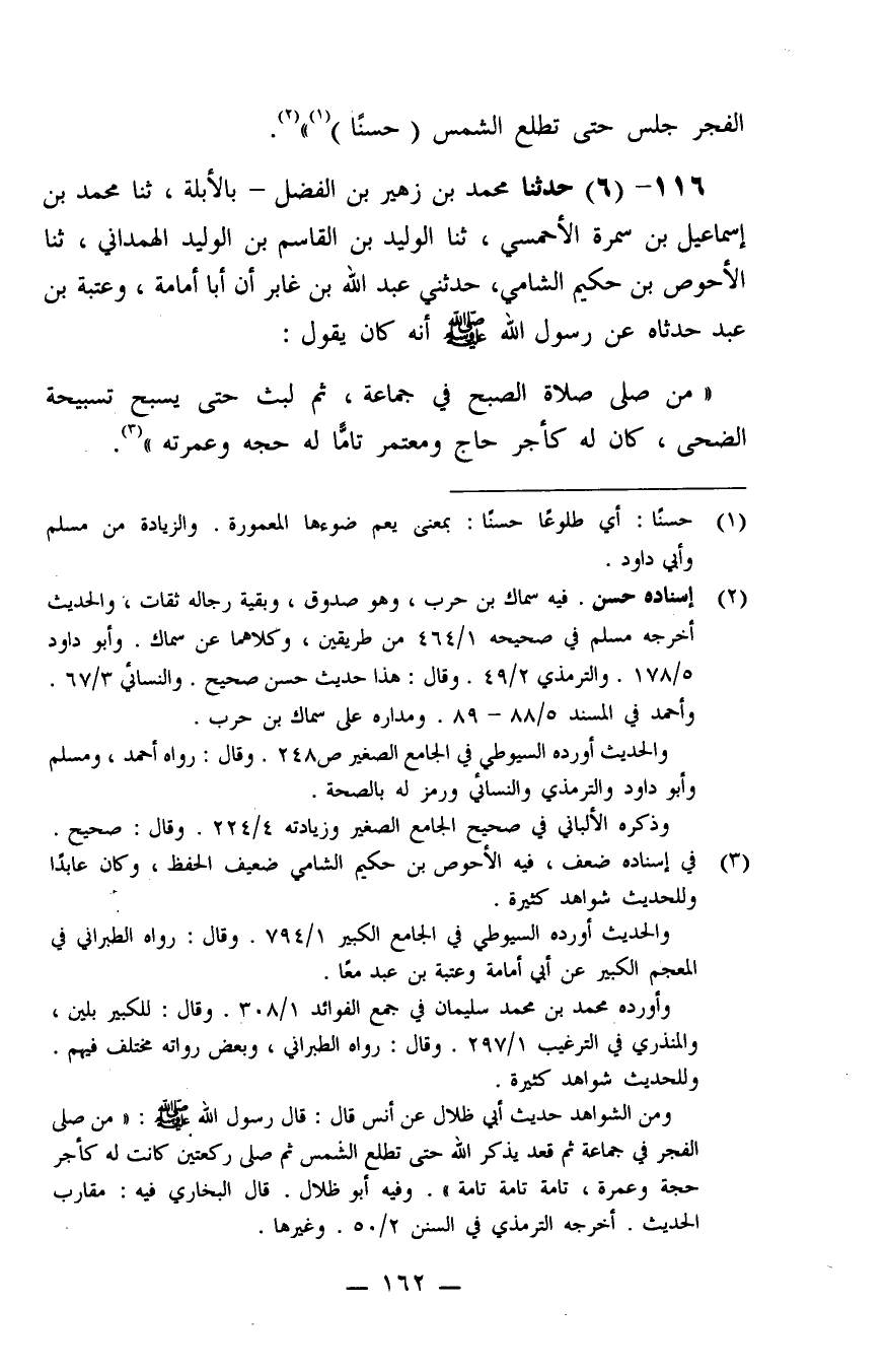 116 - حَدَّثَنَا مُحَمَّدُ بْنُ زُهَيْرِ بْنِ الْفَضْلِ، بِالْأُبُلَّةِ، ثنا مُحَمَّدُ بْنُ إِسْمَاعِيلَ بْنِ سَمُرَةَ الْأَحْمَسِيُّ، ثنا الْوَلِيدُ بْنُ الْقَاسِمِ بْنِ الْوَلِيدِ الْهَمْدَانِيُّ، ثنا الْأَحْوَصُ بْنُ حَكِيمٍ الشَّامِيُّ، حَدَّثَنِي عَبْدُ اللَّهِ بْنُ غَابِرٍ، أَنَّ أَبَا أُمَامَةَ، وَعُتْبَةَ بْنَ عَبْدٍ، حَدَّثَاهُ عَنْ رَسُولِ اللَّهِ صَلَّى اللَّهُ عَلَيْهِ وَسَلَّمَ أَنَّهُ كَانَ يَقُولُ: «مَنْ صَلَّى صَلَاةَ الصُّبْحِ فِي جَمَاعَةٍ، ثُمَّ لَبِثَ حَتَّى يُسَبِّحَ تَسْبِيحَةَ الضُّحَى، كَانَ لَهُ كَأَجْرِ حَاجٍّ وَمُعْتَمِرٍ تَامًّا لَهُ حَجُّهُ وَعُمْرَتُهُ»