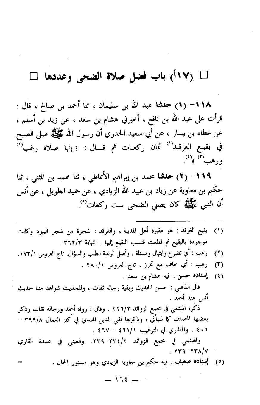 118 - حَدَّثَنَا عَبْدُ اللَّهِ بْنُ سُلَيْمَانَ، ثنا أَحْمَدُ بْنُ صَالِحٍ، قَالَ: قَرَأتُ عَلَى عَبْدِ اللَّهِ بْنِ نَافِعٍ، أَخْبَرَنِي هِشَامُ بْنُ سَعْدٍ، عَنْ زَيْدِ بْنِ أَسْلَمَ، عَنْ عَطَاءِ بْنِ يَسَارٍ، عَنْ أَبِي سَعِيدٍ الْخُدْرِيِّ، أَنَّ رَسُولَ اللَّهِ صَلَّى اللَّهُ عَلَيْهِ وَسَلَّمَ صَلَّى الصُّبْحَ فِي بَقِيعِ الْغَرْقَدِ ثَمَانِ رَكَعَاتٍ، ثُمَّ قَالَ: «إِنَّهَا صَلَاةُ رَغَبٍ وَرَهَبٍ»