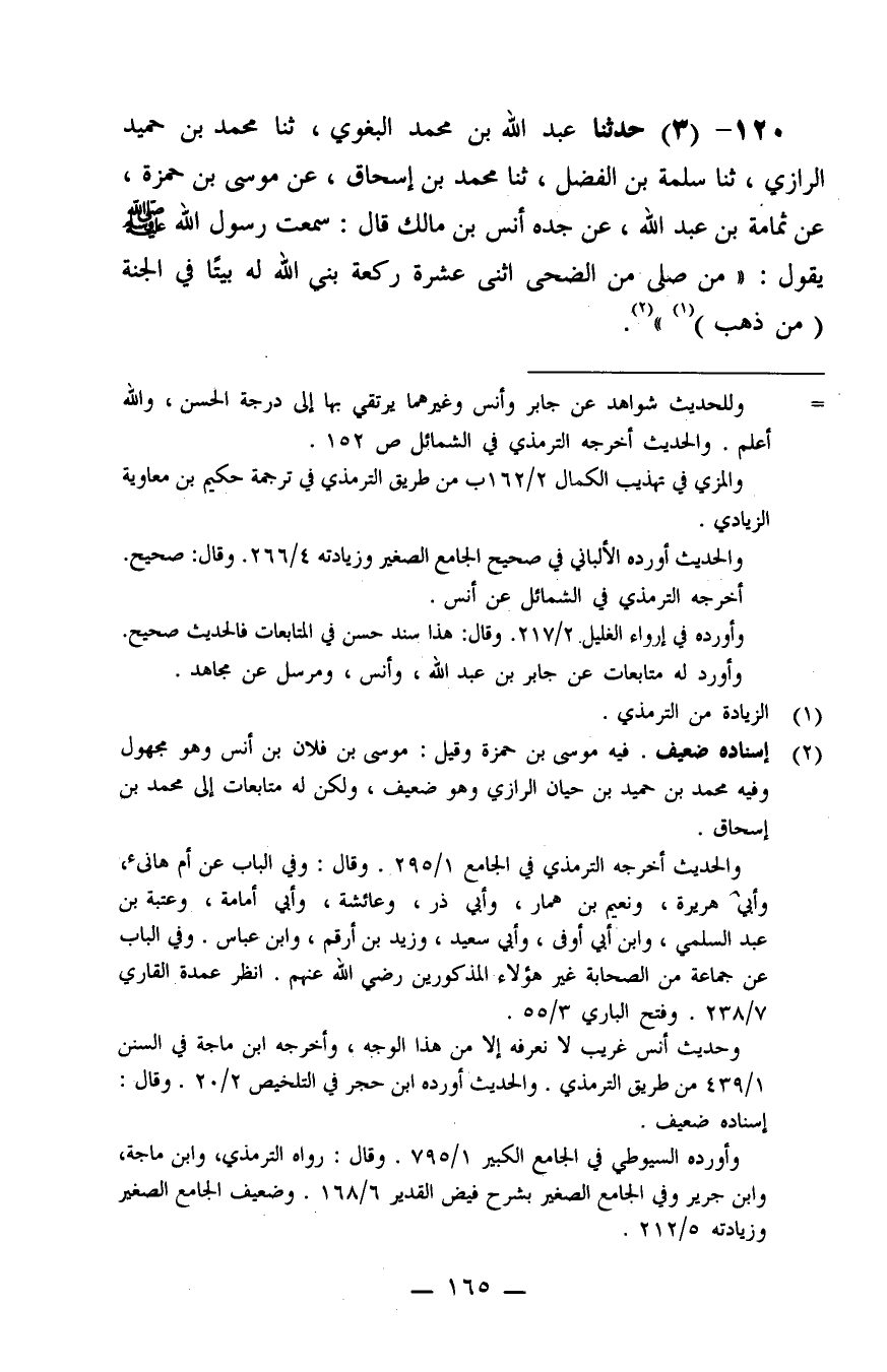 120 - حَدَّثَنَا عَبْدُ اللَّهِ بْنُ مُحَمَّدٍ الْبَغَوِيُّ، ثنا مُحَمَّدُ بْنُ حُمَيْدٍ الرَّازِيُّ، ثنا سَلَمَةُ بْنُ الْفَضْلِ، ثنا مُحَمَّدُ بْنُ إِسْحَاقَ، عَنْ مُوسَى بْنِ حَمْزَةَ، عَنْ ثُمَامَةَ بْنِ عَبْدِ اللَّهِ، عَنْ جَدِّهِ أَنَسِ بْنِ مَالِكٍ، قَالَ: سَمِعْتُ رَسُولَ اللَّهِ صَلَّى اللَّهُ عَلَيْهِ وَسَلَّمَ يَقُولُ: «مَنْ صَلَّى مِنَ الضُّحَى اثْنَتَيْ عَشْرَةَ رَكْعَةً بَنَى اللَّهُ لَهُ بَيْتًا فِي الْجَنَّةِ مِنْ ذَهَبٍ»