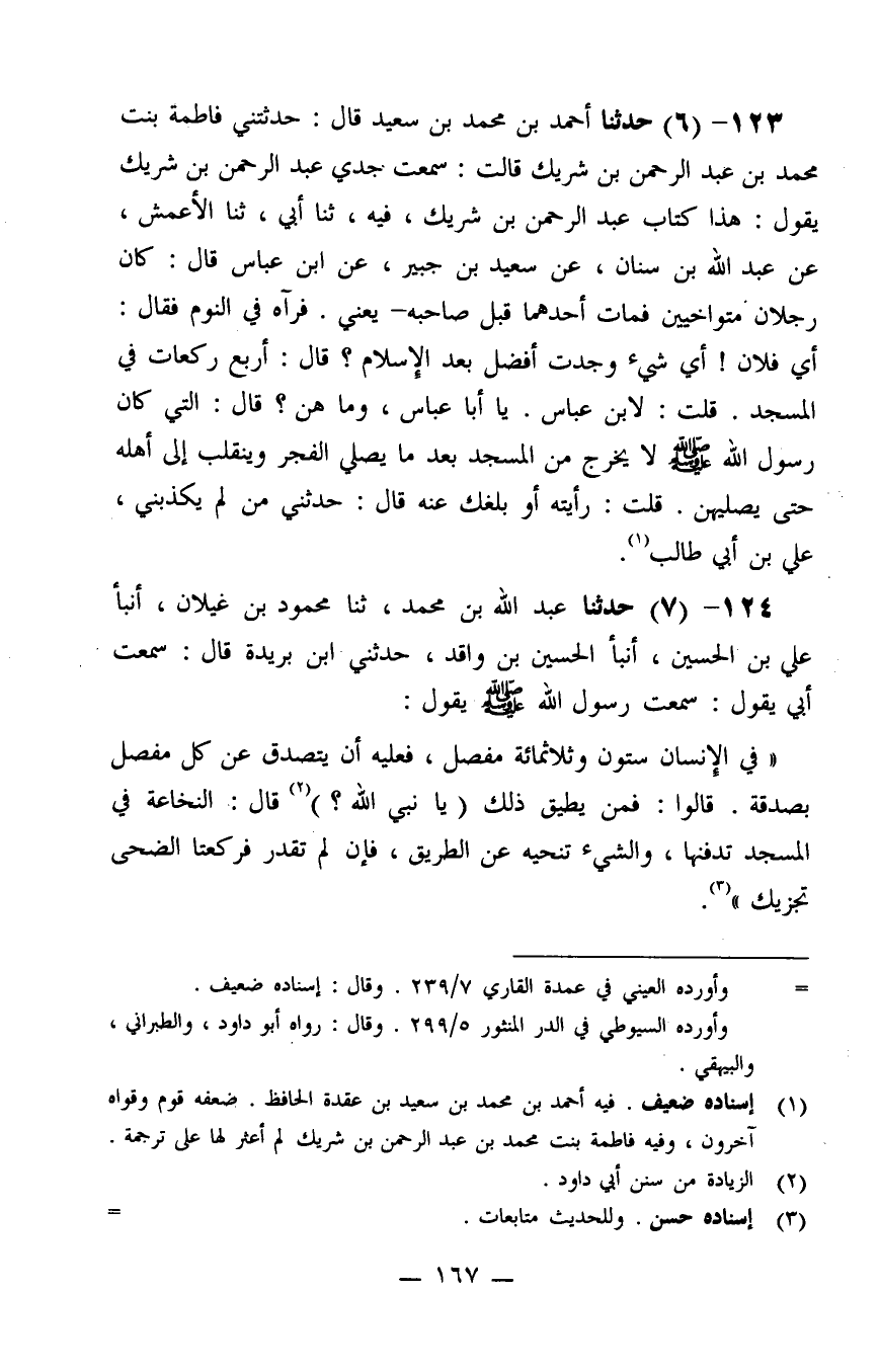 123 - حَدَّثَنَا أَحْمَدُ بْنُ مُحَمَّدِ بْنِ سَعِيدٍ، قَالَ: حَدَّثَتْنِي فَاطِمَةُ بِنْتُ مُحَمَّدِ بْنِ عَبْدِ الرَّحْمَنِ بْنِ شَرِيكٍ، قَالَتْ: سَمِعْتُ جَدِّيَ عَبْدَ الرَّحْمَنِ بْنَ شَرِيكٍ يَقُولُ: هَذَا كِتَابُ عَبْدِ الرَّحْمَنِ بْنِ شَرِيكٍ فِيهِ ثنا أَبِي، ثنا الْأَعْمَشُ، عَنْ عَبْدِ اللَّهِ بْنِ سِنَانٍ، عَنْ سَعِيدِ بْنِ جُبَيْرٍ، عَنِ ابْنِ عَبَّاسٍ، قَالَ: كَانَ رَجُلَانِ مُتَوَاخِيَيْنِ فَمَاتَ أَحَدُهُمَا قَبْلَ صَاحِبِهِ، يَعْنِي فَرَآهُ فِي النَّوْمِ، فَقَالَ: أَيْ فُلَانُ أَيُّ شَيْءٍ وَجَدْتَ أَفْضَلَ بَعْدَ الْإِسْلَامِ؟ قَالَ: أَرْبَعُ رَكَعَاتٍ فِي الْمَسْجِدِ. قُلْتُ لِابْنِ عَبَّاسٍ: يَا أَبَا عَبَّاسٍ، وَمَا هُنَّ؟ قَالَ: الَّتِي «كَانَ رَسُولُ اللَّهِ صَلَّى اللَّهُ عَلَيْهِ وَسَلَّمَ لَا يَخْرُجُ مِنَ الْمَسْجِدِ بَعْدَمَا يُصَلِّي الْفَجْرَ وَيَنْقَلِبُ إِلَى أَهْلِهِ حَتَّى يُصَلِّيهِنَّ». قُلْتُ: رَأَيْتُهُ أَوْ بَلَغَكَ عَنْهُ، قَالَ: حَدَّثَنِي مَنْ لَمْ يَكْذِبْنِي، عَلِيُّ بْنُ أَبِي طَالِبٍ