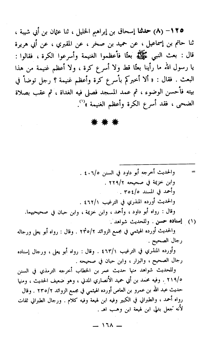 125 - حَدَّثَنَا إِسْحَاقُ بْنُ إِبْرَاهِيمَ الْخَلِيلِ، ثنا عُثْمَانُ بْنُ أَبِي شَيْبَةَ، ثنا حَاتِمُ بْنُ إِسْمَاعِيلَ، عَنْ حُمَيْدِ بْنِ صَخْرٍ، عَنِ الْمَقْبُرِيِّ، عَنْ أَبِي هُرَيْرَةَ، قَالَ: بَعَثَ النَّبِيُّ صَلَّى اللَّهُ عَلَيْهِ وَسَلَّمَ بَعْثًا فَأَعْظَمُوا الْغَنِيمَةَ وَأَسْرَعُوا الْكَرَّةَ، فَقَالُوا: يَا رَسُولَ اللَّهِ مَا رَأَيْنَا بَعْثًا قَطُّ وَلَا أَسْرَعَ كَرَّةً، وَلَا أَعْظَمَ غَنِيمَةً مِنْ هَذَا الْبَعْثِ فَقَالَ: «أَلَا أُخْبِرُكُمْ بِأَسْرَعَ كَرَّةً وَأَعْظَمَ غَنِيمَةً؟ رَجُلٌ تَوَضَّأَ فِي بَيْتِهِ فَأَحْسَنَ الْوُضُوءَ، ثُمَّ عَمَدَ الْمَسْجِدَ فَصَلَّى فِيهِ الْغَدَاةَ، ثُمَّ عَقَّبَ بِصَلَاةِ الضُّحَى، فَقَدْ أَسْرَعَ الْكَرَّةَ وَأَعْظَمَ الْغَنِيمَةَ»