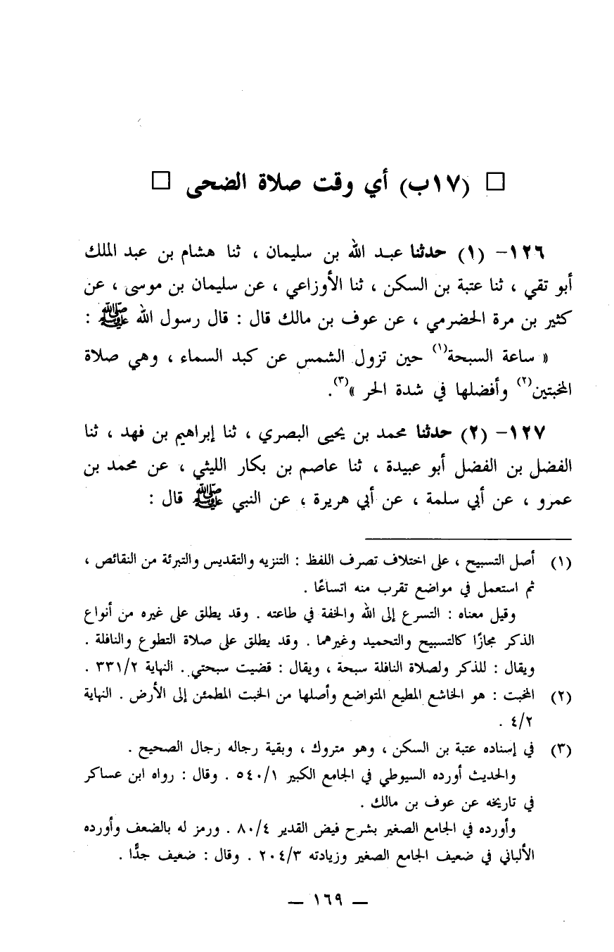 126 - حَدَّثَنَا عَبْدُ اللَّهِ بْنُ سُلَيْمَانَ، ثنا هِشَامُ بْنُ عَبْدِ الْمَلِكِ أَبُو تَقِيٍّ، ثنا عُتْبَةُ بْنُ السَّكَنِ، ثنا الْأَوْزَاعِيُّ، عَنْ سُلَيْمَانَ بْنِ مُوسَى، عَنْ كَثِيرِ بْنِ مُرَّةَ الْحَضْرَمِيِّ، عَنْ عَوْفِ بْنِ مَالِكٍ، قَالَ: قَالَ رَسُولُ اللَّهِ صَلَّى اللَّهُ عَلَيْهِ وَسَلَّمَ: «سَاعَةُ السُّبْحَةِ حِينَ تَزُولُ الشَّمْسُ عَنْ كَبِدِ السَّمَاءِ، وَهِيَ صَلَاةُ الْمُخْبِتِينَ وَأَفْضَلُهَا فِي شِدَّةِ الْحَرِّ»