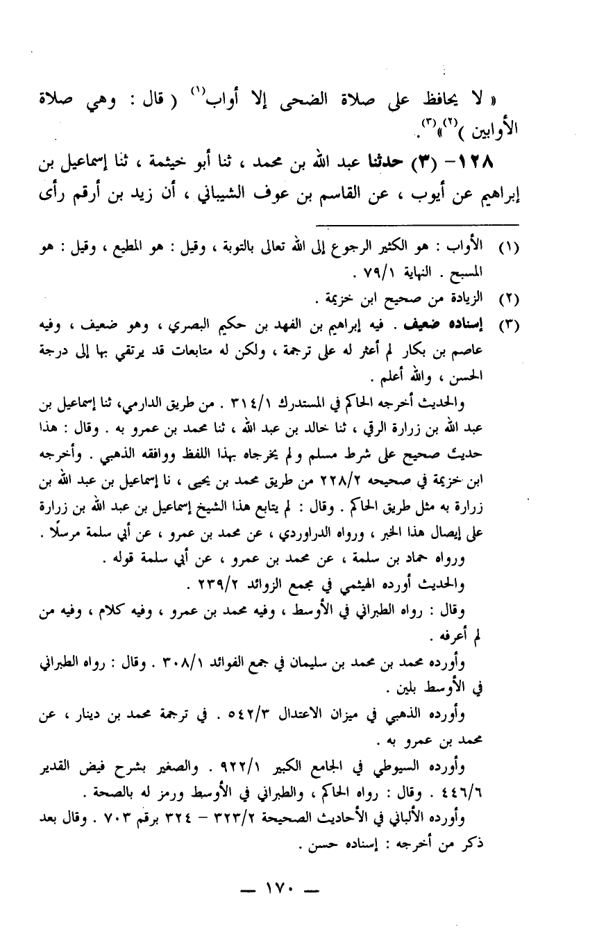 128 - حَدَّثَنَا عَبْدُ اللَّهِ بْنُ مُحَمَّدٍ، ثنا أَبُو خَيْثَمَةَ، ثنا إِسْمَاعِيلُ بْنُ إِبْرَاهِيمَ، عَنْ أَيُّوبَ، عَنِ الْقَاسِمِ بْنِ عَوْفٍ الشَّيْبَانِيِّ، أَنَّ زَيْدَ بْنَ أَرْقَمَ، رَأَى #171# قَوْمًا يُصَلُّونَ مِنَ الضُّحَى فِي مَسْجِدِ قُبَاءَ. قَالَ: لَقَدْ عَلِمُوا أَنَّ الصَّلَاةَ فِي غَيْرِ هَذِهِ السَّاعَةِ أَفْضَلُ، إِنَّ رَسُولَ اللَّهِ صَلَّى اللَّهُ عَلَيْهِ وَسَلَّمَ قَالَ: «صَلَاةُ الْأَوَّابِينَ حِينَ تَرْمَضُ الْفِصَالُ»