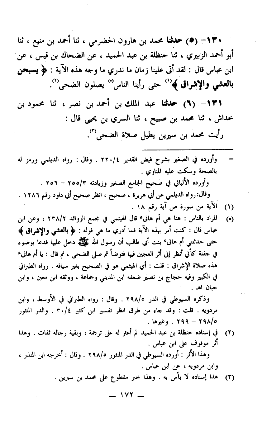 130 - حَدَّثَنَا مُحَمَّدُ بْنُ هَارُونَ الْحَضْرَمِيُّ، ثنا أَحْمَدُ بْنُ مَنِيعٍ، ثنا أَبُو أَحْمَدَ الزُّبَيْرِيُّ، ثنا حَنْظَلَةُ بْنُ عَبْدِ الْحَمِيدِ، عَنِ الضَّحَّاكِ بْنِ قَيْسٍ، عَنِ ابْنِ عَبَّاسٍ، قَالَ: " لَقَدْ أَتَى عَلَيْنَا زَمَانٌ مَا نَدْرِي مَا وَجْهُ هَذِهِ الْآيَةِ: {يُسَبِّحْنَ بِالْعَشِيِّ وَالْإِشْرَاقِ} حَتَّى رَأَيْنَا النَّاسَ يُصَلُّونَ الضُّحَى "